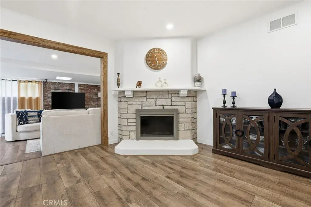 The generous living room centers around a cozy fireplace and flows seamlessly into a welcoming den, highlighted by a skylight and direct access to the backyard patio. The outdoor space has been extensively upgraded with beautiful stonework, enhanced lighting, refreshed landscaping, new lawn installation, and a restored automatic sprinkler system, creating a private retreat ideal for entertaining or relaxing.