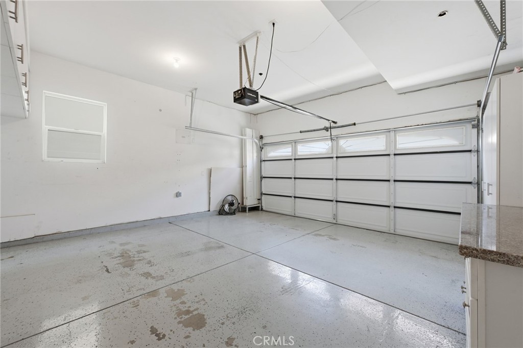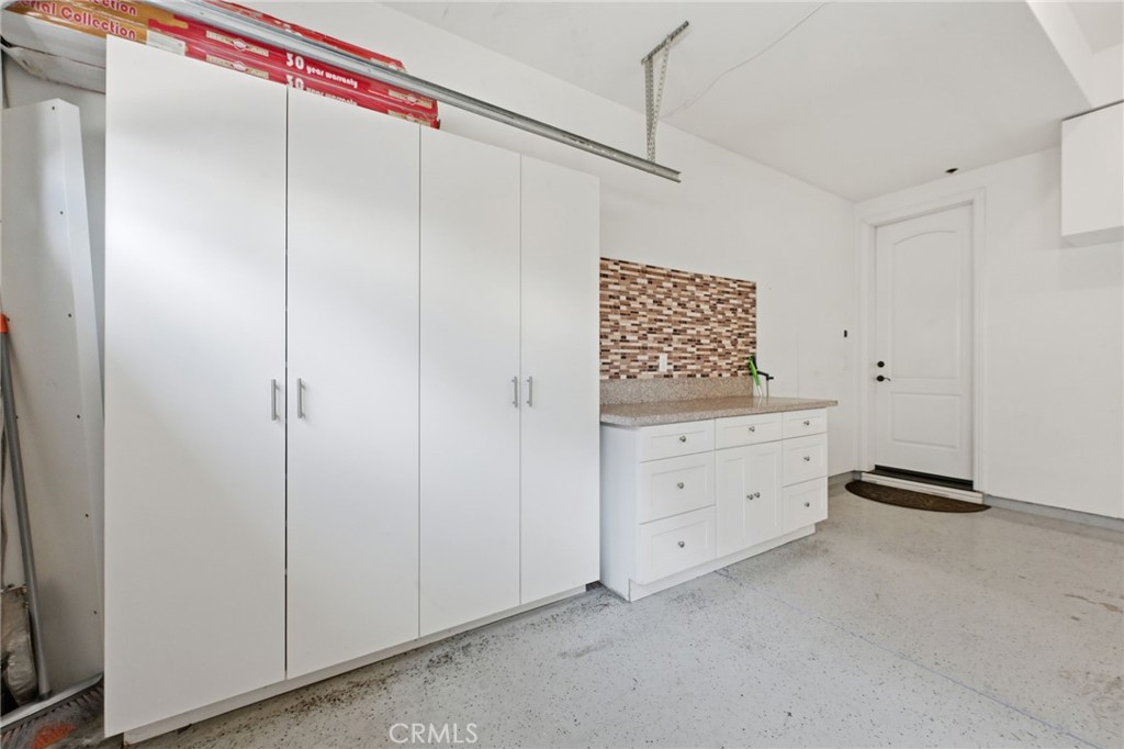 Additional features include a tankless water heater and a garage with custom cabinets and a built-in countertop, offering organized storage and added functionality.