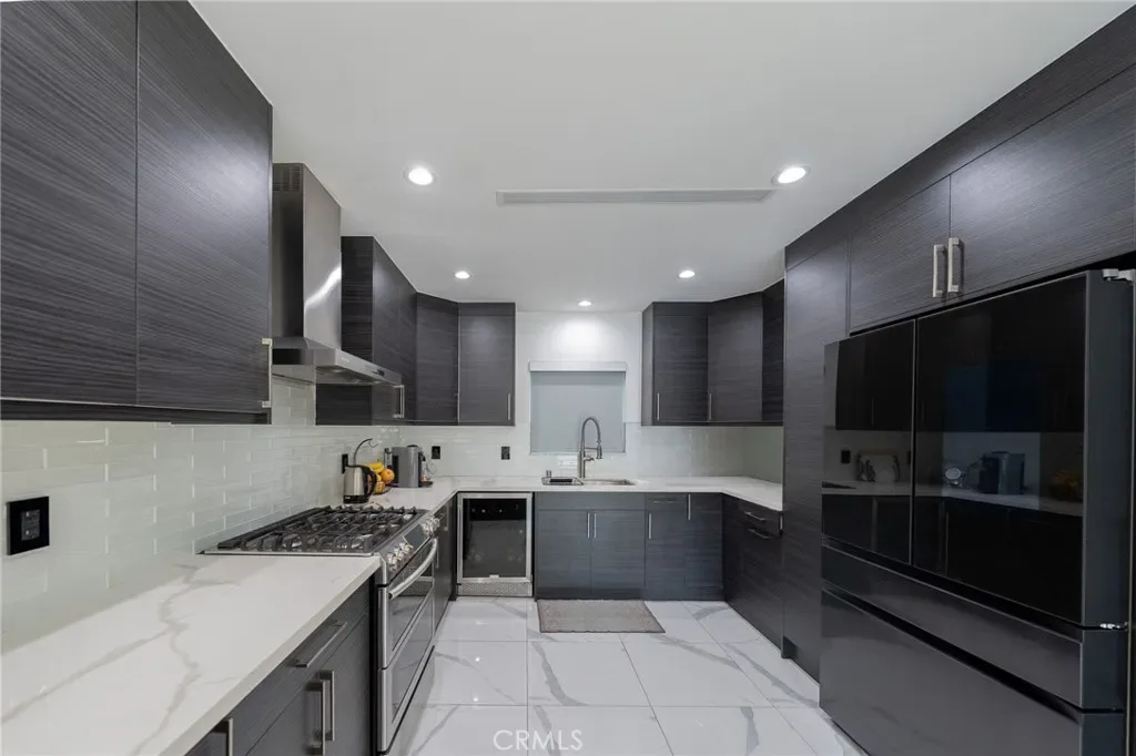 The chef’s kitchen is a masterpiece of form and function, boasting custom charcoal-textured cabinetry, striking quartz countertops with a waterfall edge, and professional-grade stainless steel appliances—including a built-in wine cooler. The living area serves as a perfect focal point with its custom-finished accent wall and integrated media center.