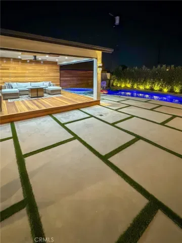 The backyard is an entertainer’s dream, featuring a massive covered deck with warm wood paneling that transitions seamlessly into a geometric hardscape with integrated turf. Relax by the sparkling pebble-tec pool and spa, surrounded by lush privacy hedging and designer lighting. This is more than a home; it’s a private retreat.