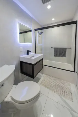 Experience the pinnacle of contemporary design in this meticulously upgraded residence. From the curb, the home impresses with a sleek facade featuring natural wood siding, smooth stucco, and a designer glass-inlay front door. Step inside to an open-concept sanctuary defined by brilliant white marble-style flooring, recessed LED lighting, and a skylight that floods the space with natural light. Home also has an upgraded solar system to minimize your utility bill!