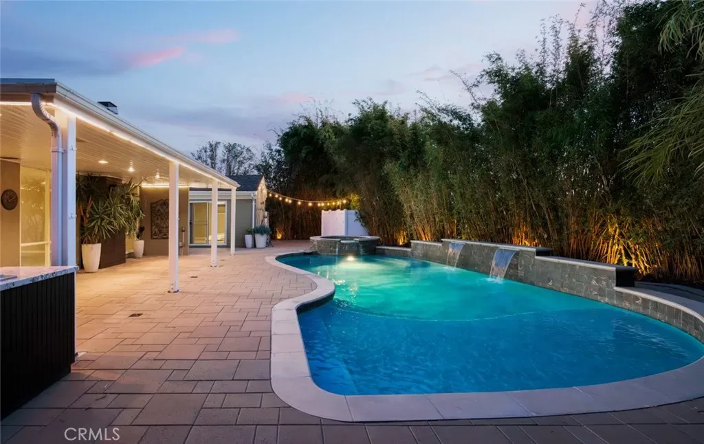 Welcome to 1032 Saint John Place in the highly desirable community of North Tustin. This beautifully maintained single-level John Lyttle designed ranch-style home offers a warm, welcoming layout and thoughtfully updated features throughout. A charming entry leads into a spacious and light-filled interior highlighted by a large open family room and an expansive kitchen designed for both everyday living and entertaining. The kitchen features a center island, granite countertops, abundant cabinetry, and a stainless-steel appliance package, creating a functional hub for gatherings and family meals. The home is currently configured with three bedrooms plus a dedicated office, which can easily function as a fourth bedroom to suit a new owner’s needs. Interior finishes include porcelain tile flooring in the main living areas, carpet in the bedrooms and family room, and wood flooring in the office, all part of a comprehensive remodel completed in 2008. Comfort and efficiency have been thoughtfully maintained with key system upgrades, including a new high-efficiency heat pump, air handler, and all-new ducting installed in 2024. The roof features a CertainTeed Presidential 50-year composition shingle installed in 2007. Step outside to a private backyard retreat designed for relaxation and entertaining. The outdoor space features a large built-in wraparound BBQ with granite countertops and extensive cabinet storage, perfect for hosting gatherings. A covered shaded patio provides a comfortable outdoor living area, while the elegant saltwater pool and spa—remodeled in 2018—feature a Baja shelf and twin spillway waterfalls, creating a true resort-style setting. Additional highlights include double-pane windows through most of the home, a 200-amp upgraded electrical panel, and no HOA. Combining classic ranch-style charm, modern upgrades, and an exceptional North Tustin location, this home offers comfortable California living with spaces designed for both everyday enjoyment and memorable entertaining.