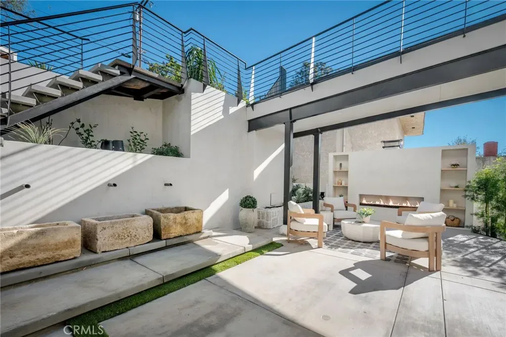 Multiple outdoor spaces provide endless options for relaxation and entertaining, including a private courtyard with fireplace, fountains, mature olive trees, and landscape lighting. Backyard renderings are available, offering future potential for a pool and expanded outdoor living.