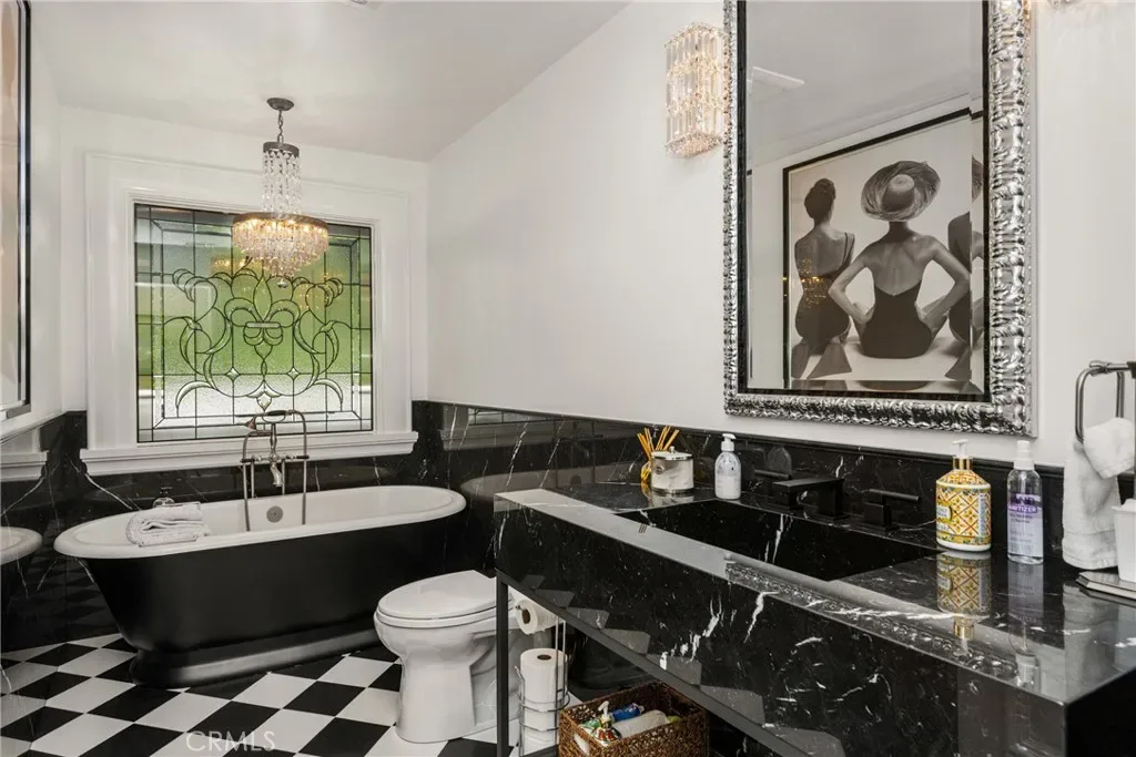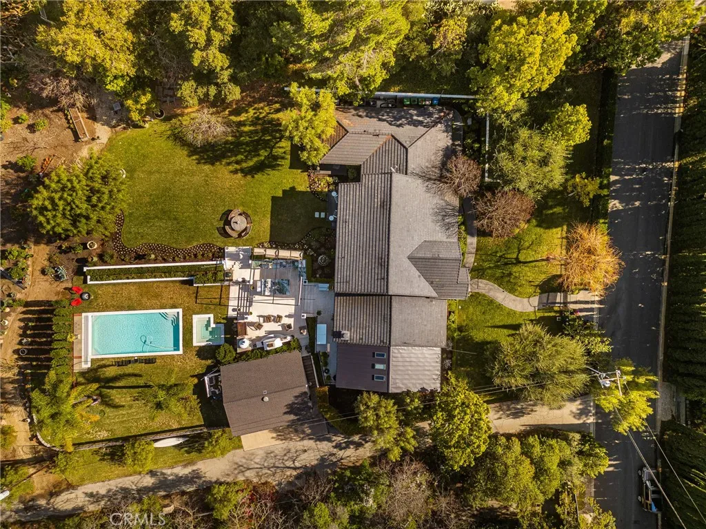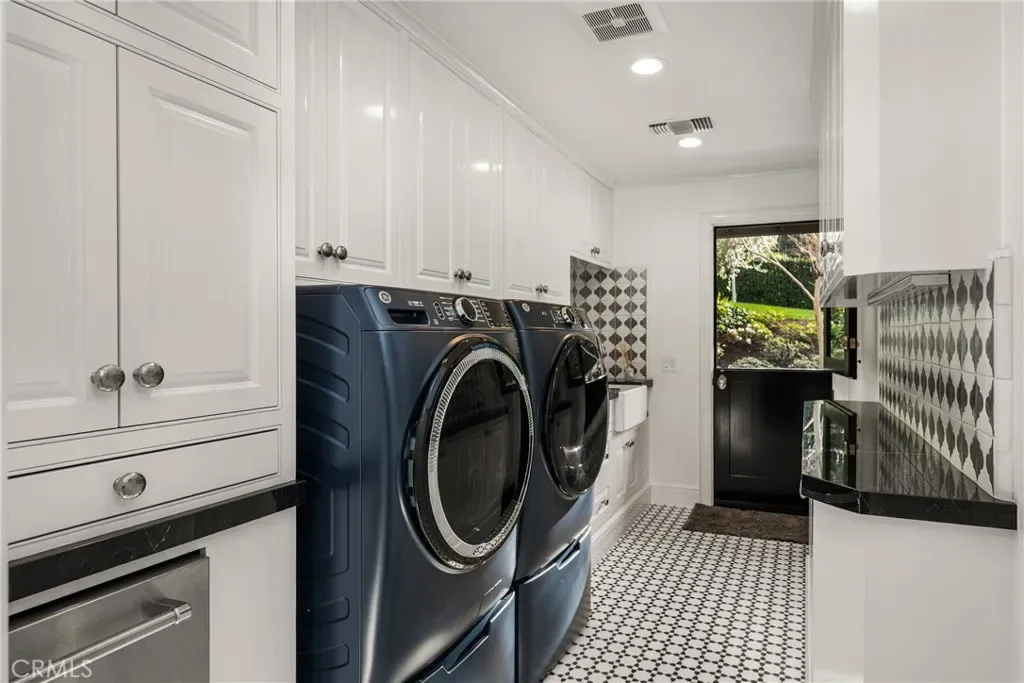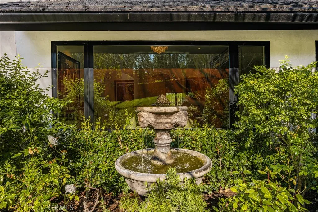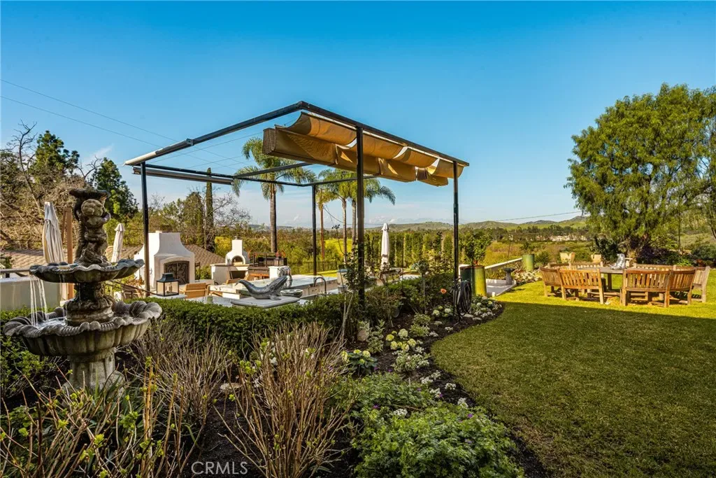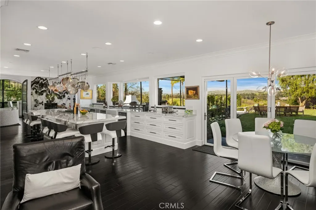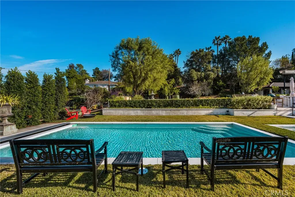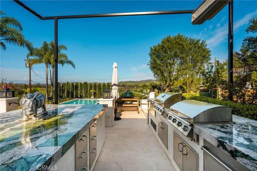 The backyard unfolds as a private resort A sparkling pool and spa with limestone coping echo the terrace finishes, while multiple lounge areas and an expansive patio create an extrordinary environment. The fully integrated outdoor kitchen is outfitted with dual barbeque, refrigerators, dishwashers, and stainless steel cabinetry beneath striking slabs of richly colored malachite quartz countertops.