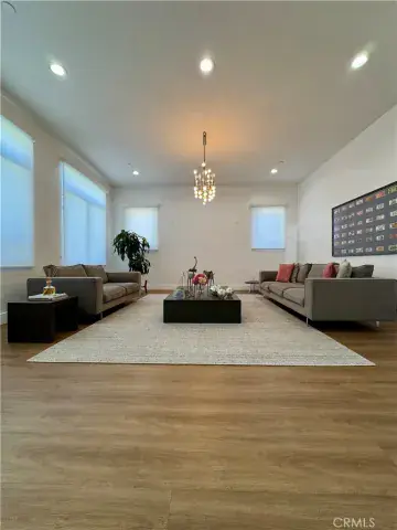 The main floor boasts a formal living and dining room, along with a gourmet chef’s kitchen outfitted with floor-to-ceiling oak cabinetry, an oversized island, premium Jenn-Air stainless steel appliances, stone countertops, and a large walk-in pantry perfect for both entertaining and everyday living.