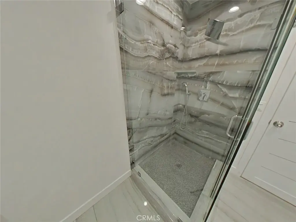 The chef’s kitchen is both stylish and functional, featuring custom white shaker cabinetry, quartz countertops, and a large center island with warm wood accent paneling. Stainless steel appliances, a designer backsplash behind the range, ample storage, and recessed lighting complete this modern space. Bathrooms are tastefully updated with glass-enclosed walk-in showers, designer tile flooring, contemporary vanities, and modern fixtures. Two spacious primary suites offer private bathrooms with dual-sink layouts, while all four bedrooms include walk-in closets.