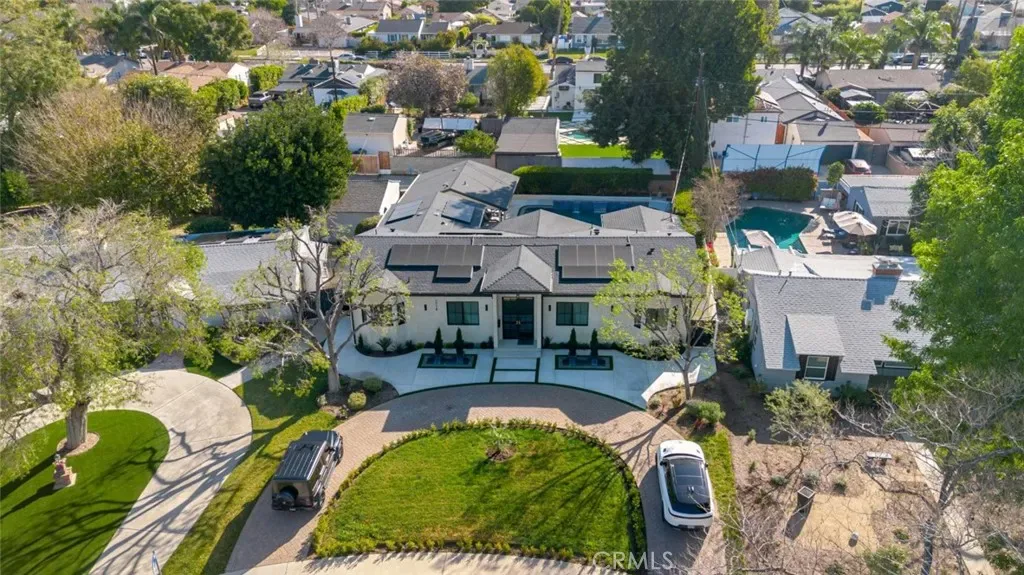 The outdoor space is a true private oasis, complete with a sparkling pool and spa, ideal for relaxing or hosting gatherings. Lush surroundings and a serene setting create a resort-style experience right at home. Additional highlights include a detached two-car garage, energy-efficient solar panels, and an elegant circular driveway providing convenient drive-in and drive-out access while enhancing the home’s impressive curb appeal.