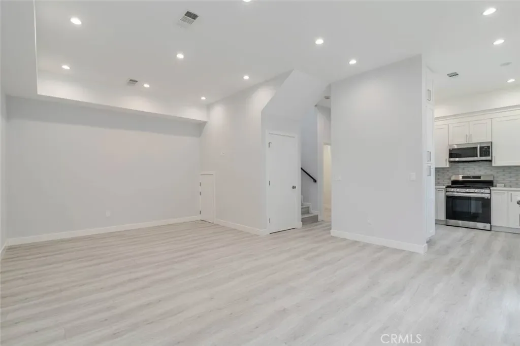 The open-concept layout is filled with natural light and showcases a modern kitchen complete with sleek quartz countertops, stainless steel appliances, and ample cabinetry, perfect for everyday living and entertaining. The inviting living and dining areas create a seamless flow, enhancing the home’s airy and welcoming feel.