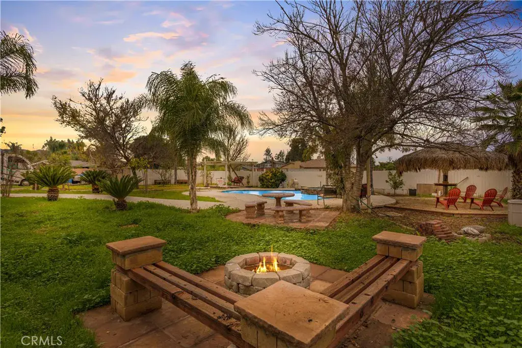 Outdoors is an ENTERTAINER’S DREAM: enjoy your private in-ground pool and spa, vast covered patio and palapa shade, mature landscaping with queen palms, a built-in fire pit and cement table — ideal for alfresco dining or relaxing with friends and family.