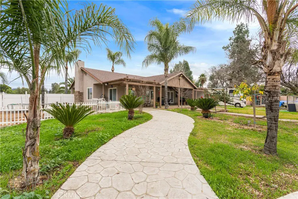 Exceptional single-story ranch-style home on nearly one acre in desirable Nuevo! This 3-bed, 2-bath residence offers 1,502 ± sq ft of thoughtfully designed living space with vaulted ceilings, abundant natural light, and a layout perfect for both everyday living and entertaining. Situated on a private, level lot, this property combines country charm with modern comfort.