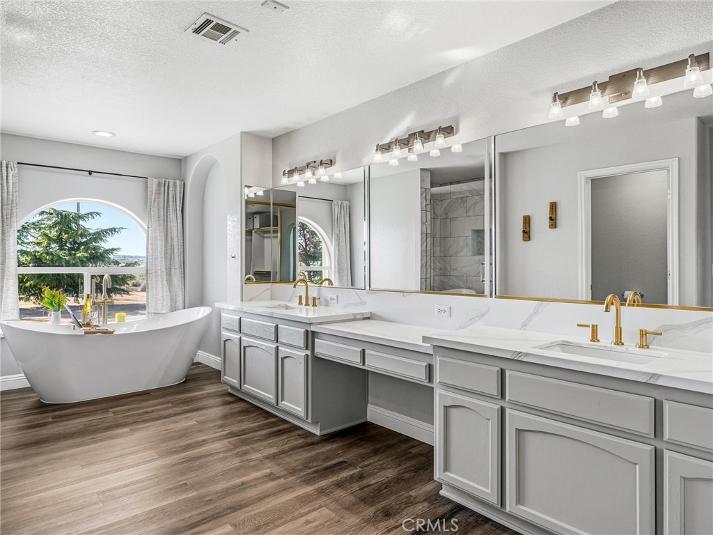 The home has been refreshed with new interior paint and upgraded with durable Life Proof flooring throughout. The inviting family room features a cozy wood-burning fireplace, while the luxurious primary suite offers its own fireplace and a fully remodeled spa-inspired bathroom. A separate mini master suite includes a private bathroom and walk-in closet—perfect for guests or multi-generational living.