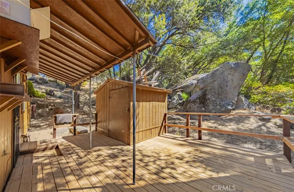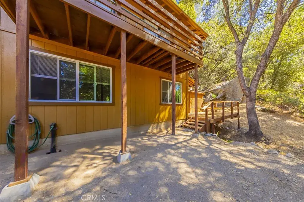 Great retreat home tucked on .82+/- acre among lovely shade trees and unique rock outcroppings! This could be a fabulous starter home or an income earning rental with 2 bedrooms and 1 1/2 bathrooms. Enjoy the peace and quiet on your back porch while relaxing having your breakfast and a storage room off the deck. The feeling of living in the outdoors with beautiful large rock outcroppings amongst the forest, will definitely put your mind to ease. This home is on the smaller side but very cute! Enjoy the warmth of your Pellet stove in the living room on those cooler nights, and the ease to bring in more pellets in the storage room that is right outside the front door and there is a ceiling fan and built-in bookshelves. The dining area and kitchen are full sizes with electric range, dishwasher, range hood, tile counter tops, extra cabinet space and a large walk-in pantry just off the kitchen and laundry room. Newer windows installed throughout the home. The 2 bedrooms and full bathroom are located upstairs, while a smaller 1/2 bath is located downstairs near the laundry room. This property has a convenient location a short drive from downtown Oakhurst and a short drive to beautiful Bass Lake Recreational area. There is a front carport and additional parking space for an RV or additional vehicles that is uncovered. Come and see this house that’s great if you want to downsize, use it as a monthly rental or make it your new home! Make sure you enjoy the multiple levels of decks and listen for the birds!