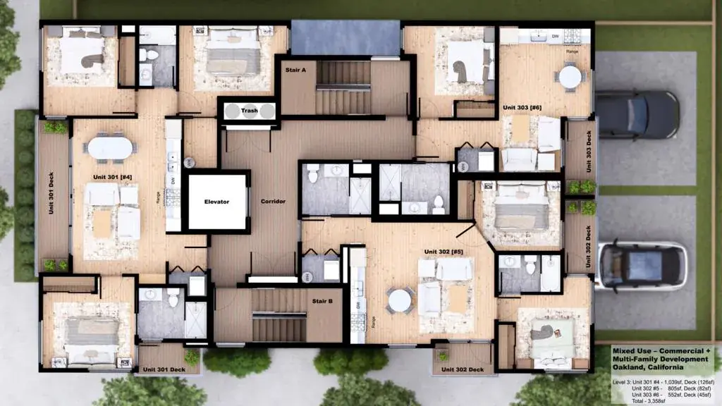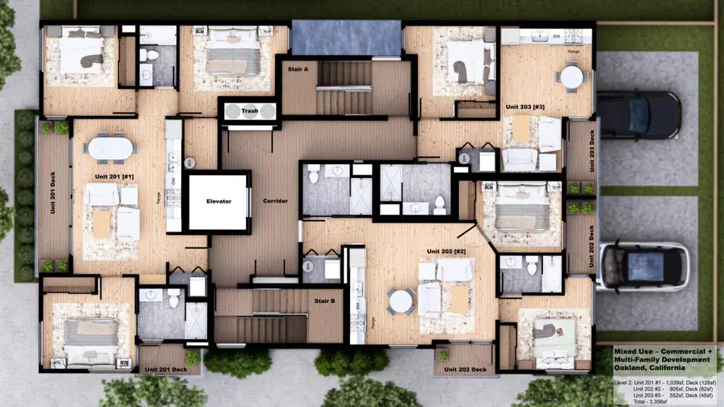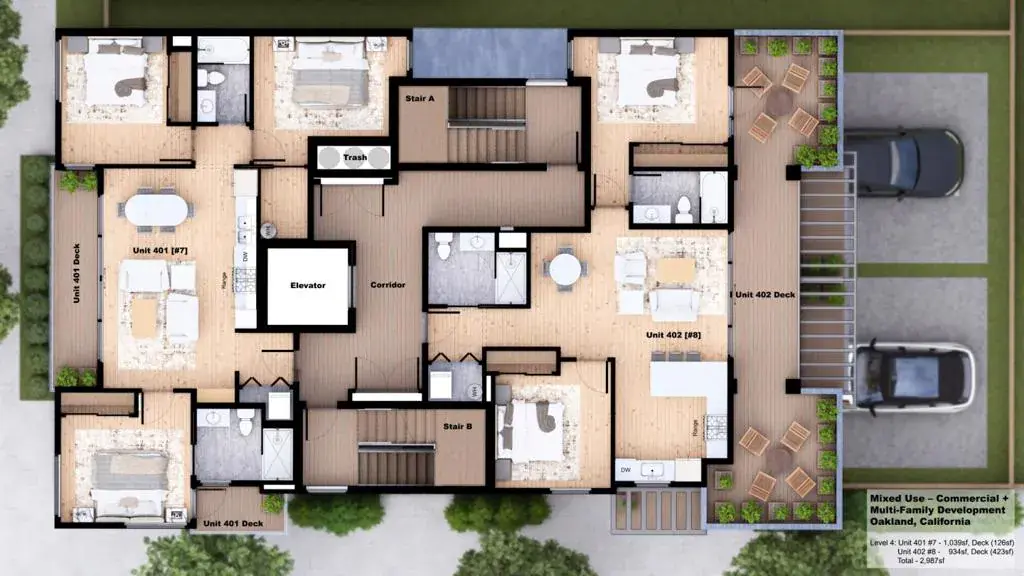 Development site w/plans in thriving Paradise Park neighborhood of Oakland near Berkeley border. Ground floor commercial space with 10 residential units above. Mix of four 3 bed, three 2 bed, two 1 bed, and one studio. All with deck space many with deck and patio space. Very large common deck and common rooftop space all incorporated into sleek modern design. Other conveniences incorporated for leisure like living. Will be sold fully entitled. Highly desired neighborhood with spaces like Mujiri across the street, Kitchen on Fire cooking school next to it and Paradise Park Cafe, Los Moles, Rotten City Pizza a stone’s throw away.