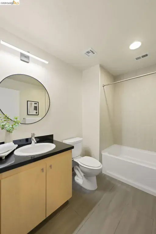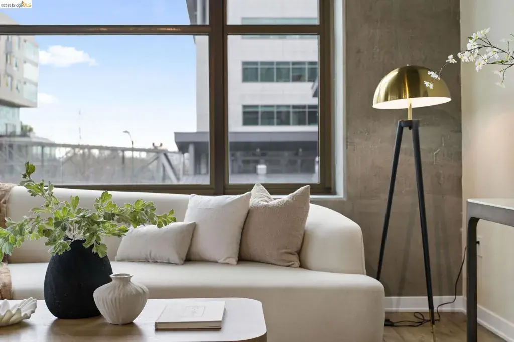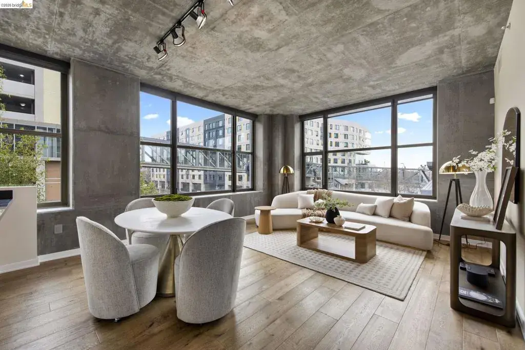 An incredible opportunity at The Bond—this two-bedroom, two-bath corner condo offers 1,260 sq ft of light-filled urban living in Jack London Square. The split-bedroom layout provides privacy, while open living and dining areas are perfect for entertaining. Loft-inspired details include exposed concrete walls and ceilings combined with sleek white walls and DuChateau wood floors. The chef’s kitchen features Bertazzoni oven and microwave and Bosch dishwasher. A major highlight of this configuration that sets it apart is the spa-like primary suite with a standalone soaking tub, separate shower, dual sinks and walk in closet. Additional custom windows added in the bedrooms make this unit a stand out in the building. The secondary bedroom is a perfect space for a home office; guest room, or kids room with a bathroom (shower over tub) right next to it. There is also in-unit laundry with additional storage, and deeded one-car parking in a secure garage. The Bond is a fabulous top notch Jack London Square building with concierge service, business center, a modern hotel-esque lobby; gym, bbq/community area, and huge dedicated dog park – making this a sought after landing space for professionals, do-ers, travelers, furparents, commuters or work-from-homers. Come tour, and fall in love!