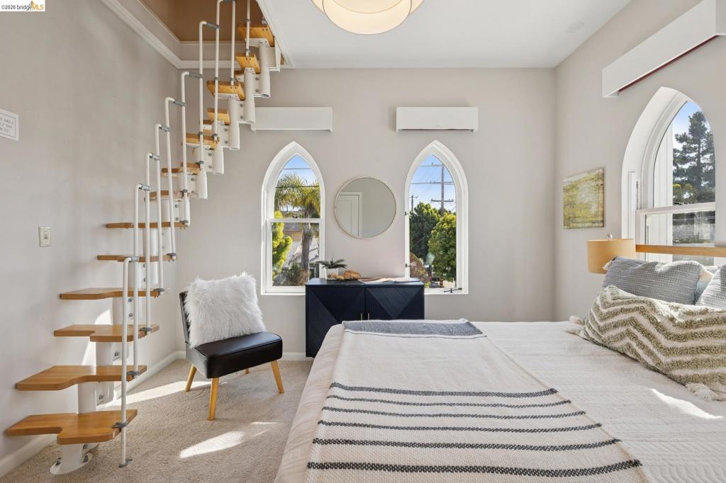 This distinctive condominium is part of a dramatic church conversion in the heart of Bushrod. Soaring ceilings and original stained-glass windows fill the home with natural light, blending historic character with modern design. The open kitchen features a substantial butcher-block island and contemporary finishes, flowing into generous living and dining areas. Two bedrooms and a full bath are located on the main level, while the upper level offers a spacious primary suite, a bright bonus workspace with a wall of glass, and access to a private rooftop deck. Gated parking, in-unit laundry, storage, and secure package delivery add everyday convenience. Walk Score 92 with easy access to Rockridge, Elmwood, and BART.