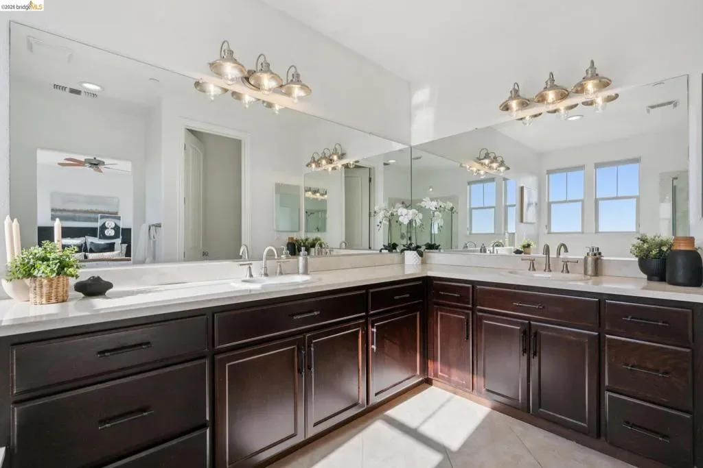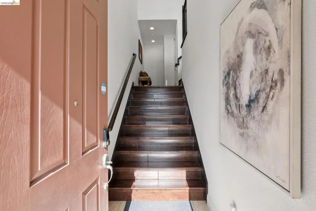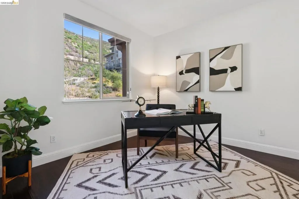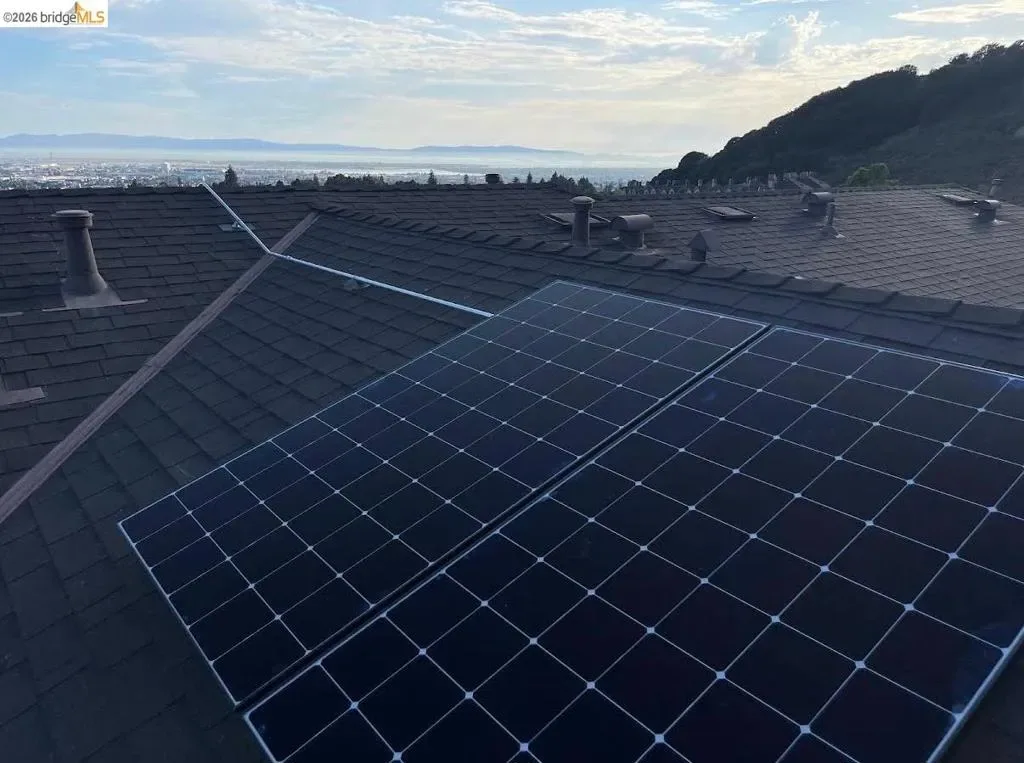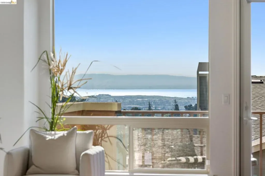 Stunning contemporary townhome with panoramic San Francisco Bay views, located in the desirable Monte Vista Villas community in Oakland Hills. Built in 2013, this 4-bedroom, 3-bath residence offers an open floor plan filled with natural light and hardwood floors. The main level features an open living and dining area that opens to a view balcony, along with a chef’s kitchen equipped with stainless steel appliances, granite countertops, a large center island, ample storage, and access to a private rear patio with avocado and pomegranate trees, ideal for entertaining. A full bedroom and bathroom on this level provide excellent flexibility. Upstairs, the spacious primary suite enjoys bay views and a spa-style bathroom with dual vanity and soaking tub, accompanied by two additional bedrooms, a full bath, and a laundry room. Additional upgrades include an owned 3.4 kW solar system, EV charger, hot water recirculation system, reverse osmosis drinking water filtration, home security system with outdoor cameras, automated Stoneside blinds, and an automated garage with MyQ monitoring. An oversized attached two-car garage offers direct interior access. Community amenities include a clubhouse, fitness center, walking paths, and playgrounds. Easy access to highway 580, 13 and 24.