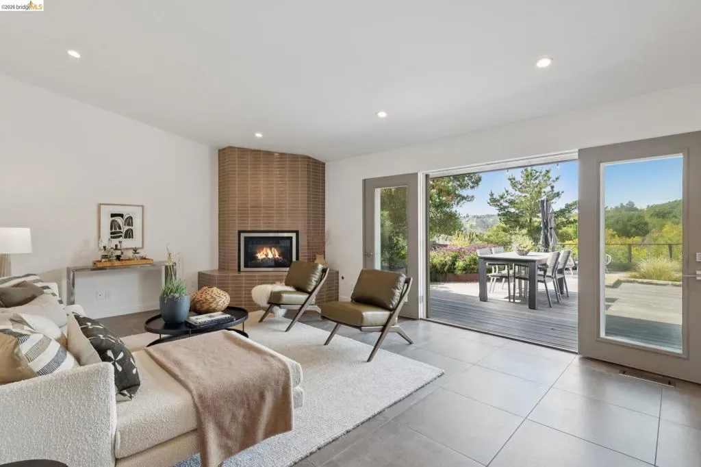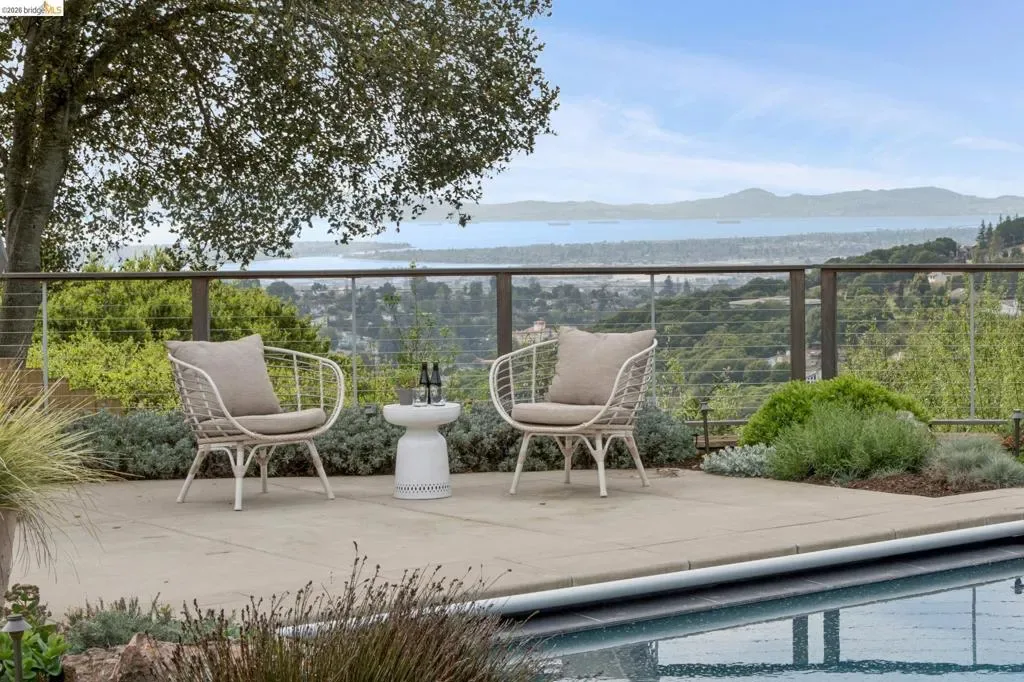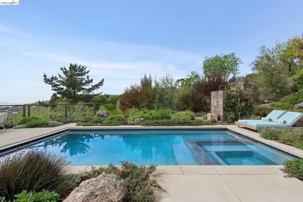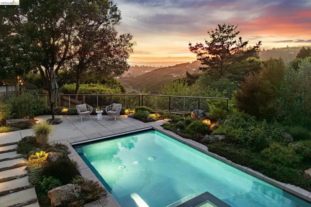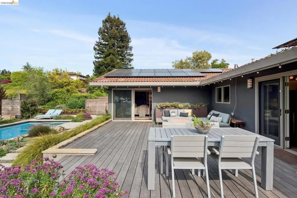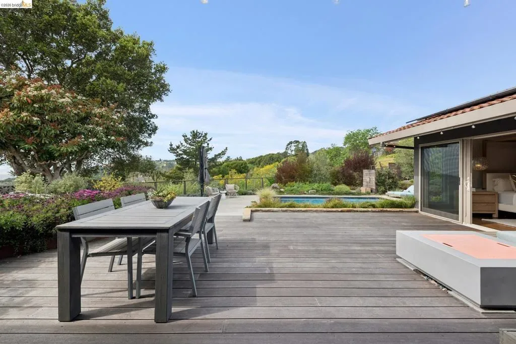 Masterfully reimagined modern gem with sparkling bay views and crystal-blue pool. Spanning 2236 square feet, the home’s level floor plan emphasizes effortless flow and clean architectural lines. The heart of the home is the custom kitchen with premium finishes. The open-concept floor plan connects kitchen with family room, where a tiled fireplace offers a tactile focal point. From here, move outdoors to an impressive private oasis. A broad Batu hardwood deck hosts lounge seating and firepit, and generous dining space. Three steps down, the boldly hardscaped patio features a zen-like swimming pool with integrated spa. Float and gaze at the bay views beyond, or enjoy an outdoor shower. The spacious interior hosts a primary retreat with many fine accents, also offering access the backyard for a midnight dip. Stunning, calming, inviting. Soak in wellness in this Sequoyah Hills sanctuary.