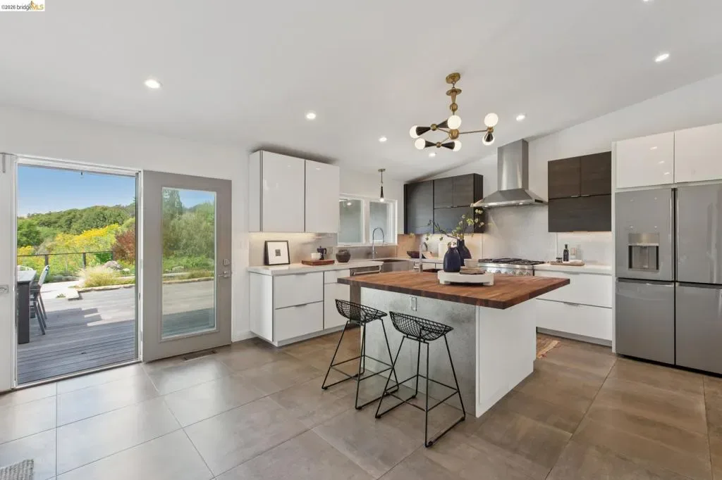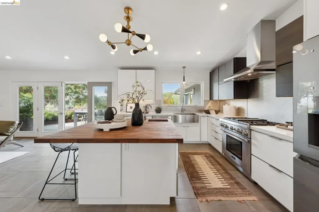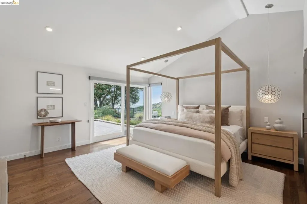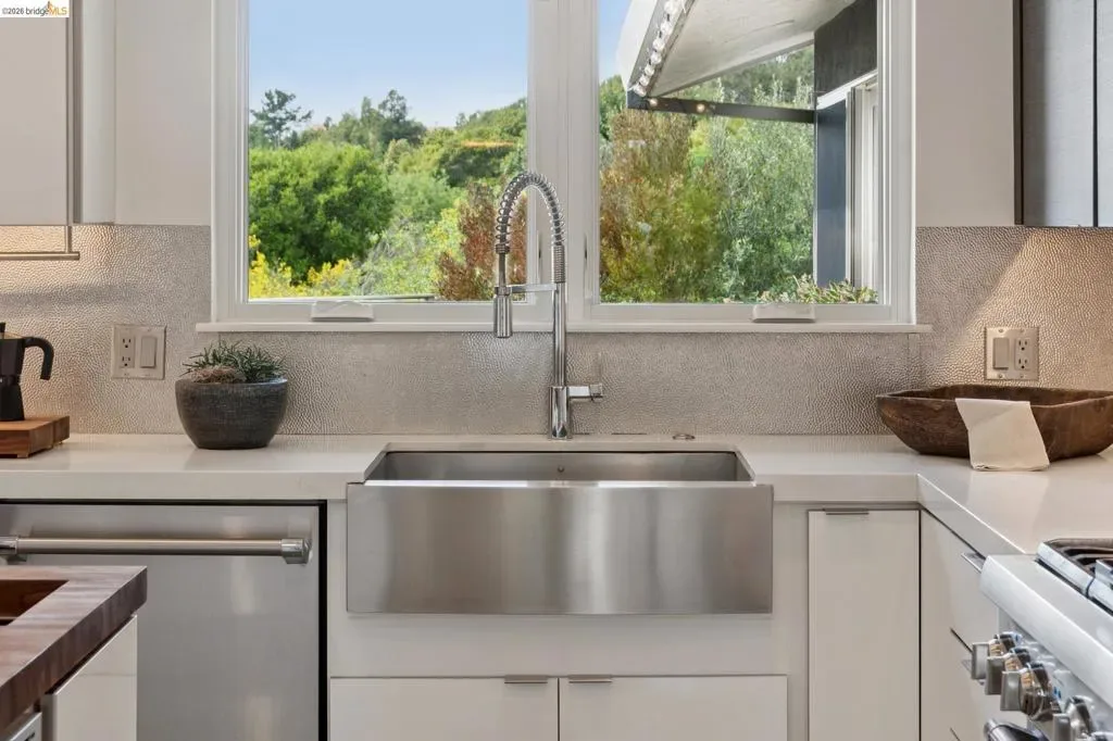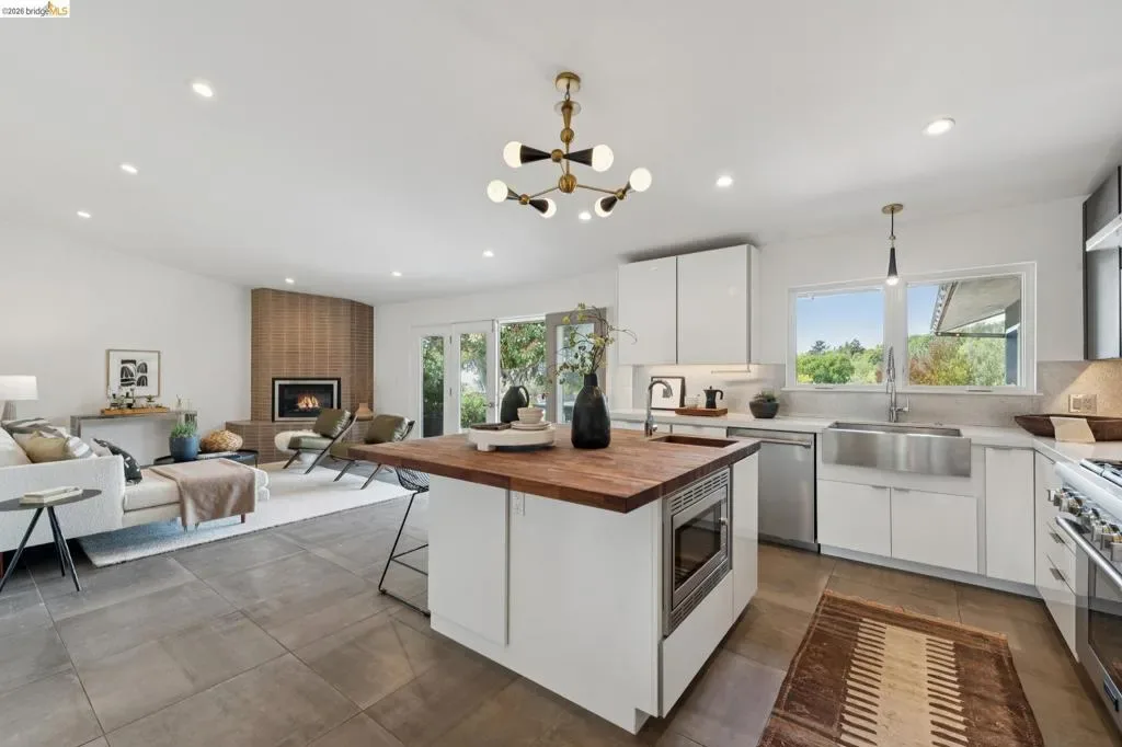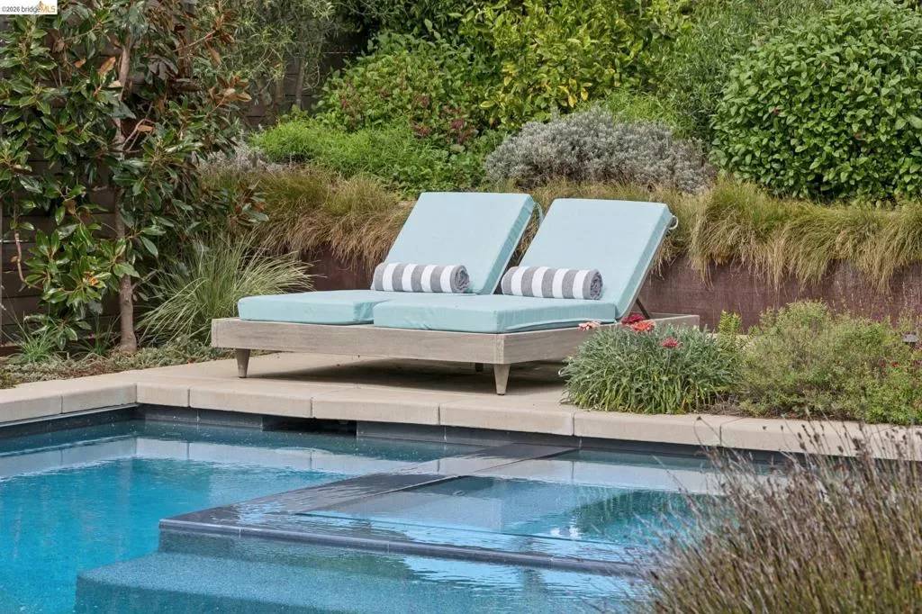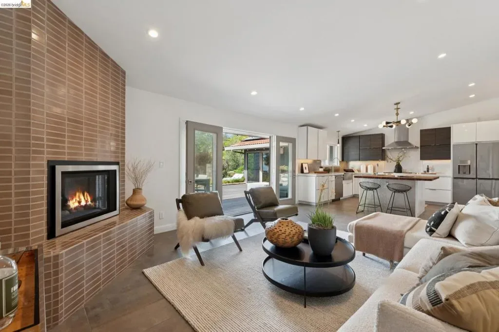 Masterfully reimagined modern gem with sparkling bay views and crystal-blue pool. Spanning 2236 square feet, the home’s level floor plan emphasizes effortless flow and clean architectural lines. The heart of the home is the custom kitchen with premium finishes. The open-concept floor plan connects kitchen with family room, where a tiled fireplace offers a tactile focal point. From here, move outdoors to an impressive private oasis. A broad Batu hardwood deck hosts lounge seating and firepit, and generous dining space. Three steps down, the boldly hardscaped patio features a zen-like swimming pool with integrated spa. Float and gaze at the bay views beyond, or enjoy an outdoor shower. The spacious interior hosts a primary retreat with many fine accents, also offering access the backyard for a midnight dip. Stunning, calming, inviting. Soak in wellness in this Sequoyah Hills sanctuary.
