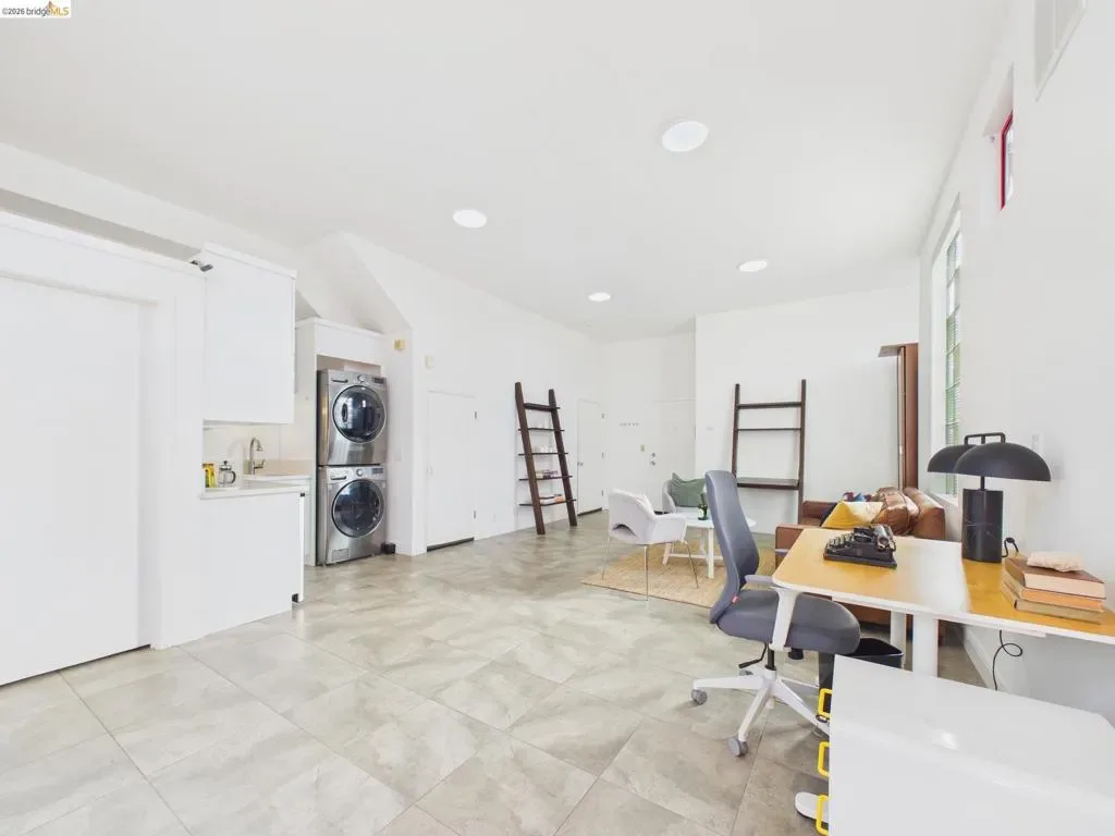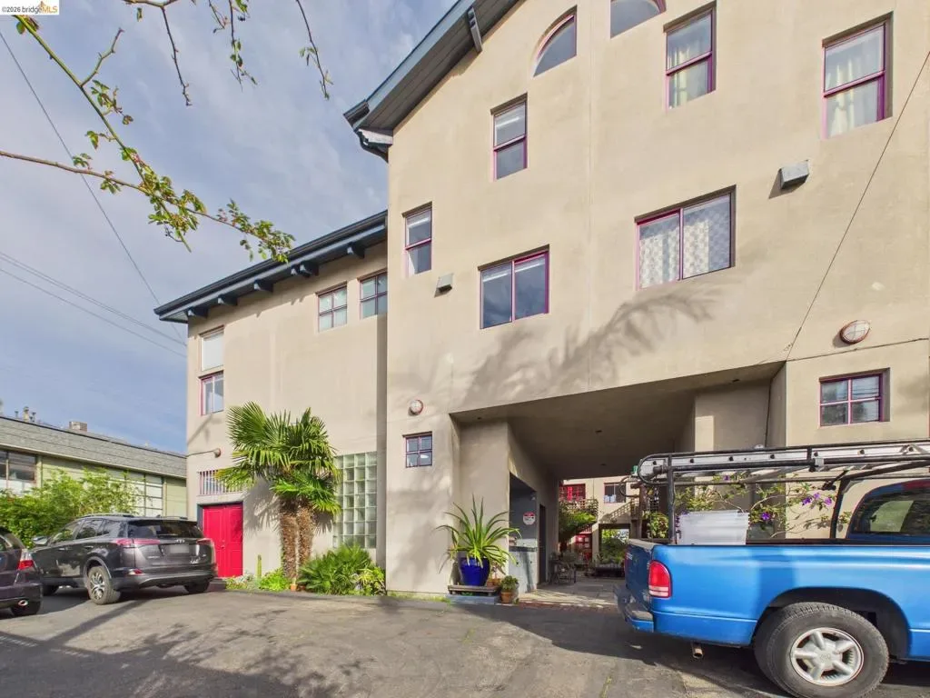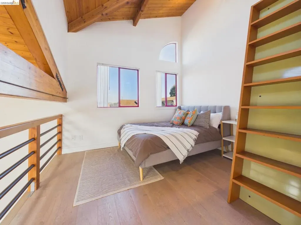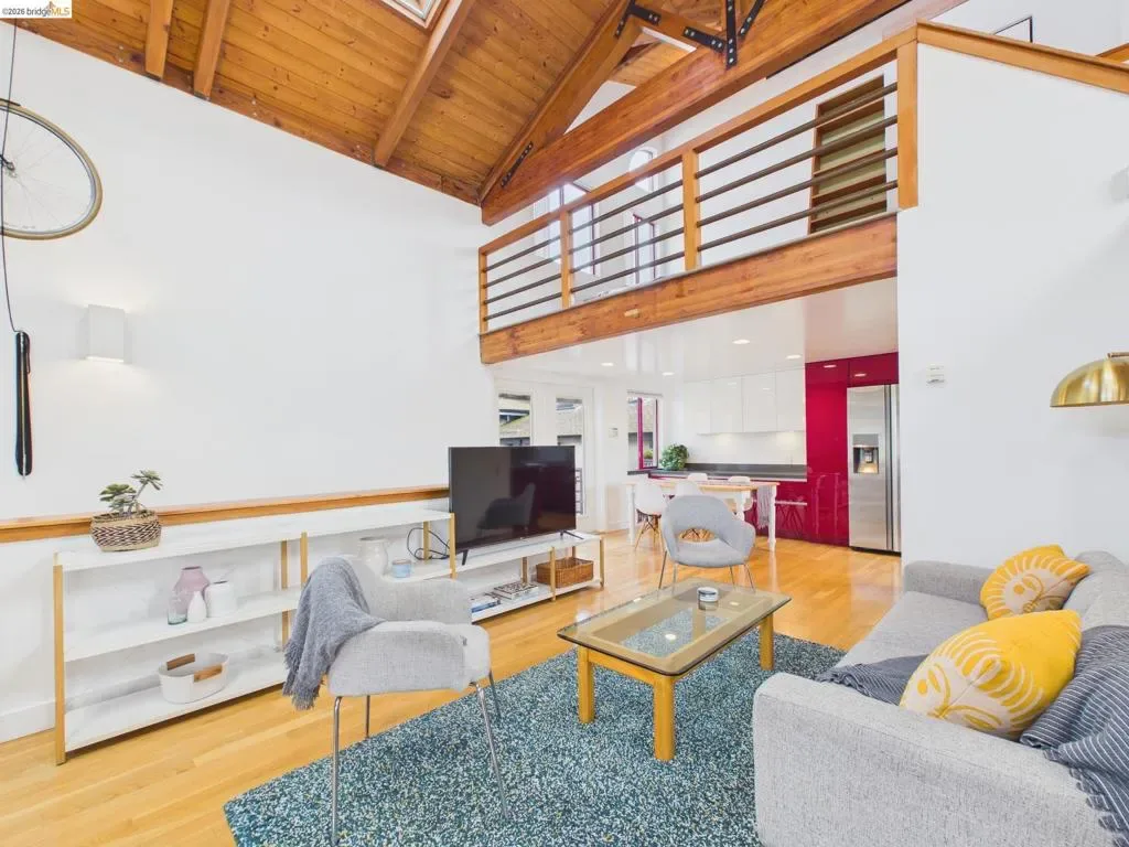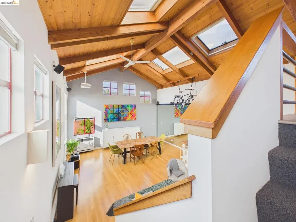A rare fusion of Italian-inspired design and live/work functionality, this striking 1,636 sqft loft unfolds across three light-drenched floors in centrally located West Oakland. Soaring vaulted ceilings with exposed wood beam trusses set a dramatic stage — the kind of volume that invites creativity, complete with electrical connections in the rafters for studio or shop equipment. The showpiece kitchen dazzles with high-gloss crimson cabinetry, premium stainless appliances, and a chic dining space ideal for entertaining. Upstairs, the loft bedroom suite offers an intimate cathedral retreat with skylights and warm wood finishes. Two contemporary bathrooms feature porcelain tile walls and refined fixtures throughout. The flexible first-floor studio — with its own private entrance, kitchenette, and stacked laundry — functions seamlessly as a guest suite or creative studio. Outside, a lush shared courtyard with mature palms and a fountain creates a serene urban oasis.