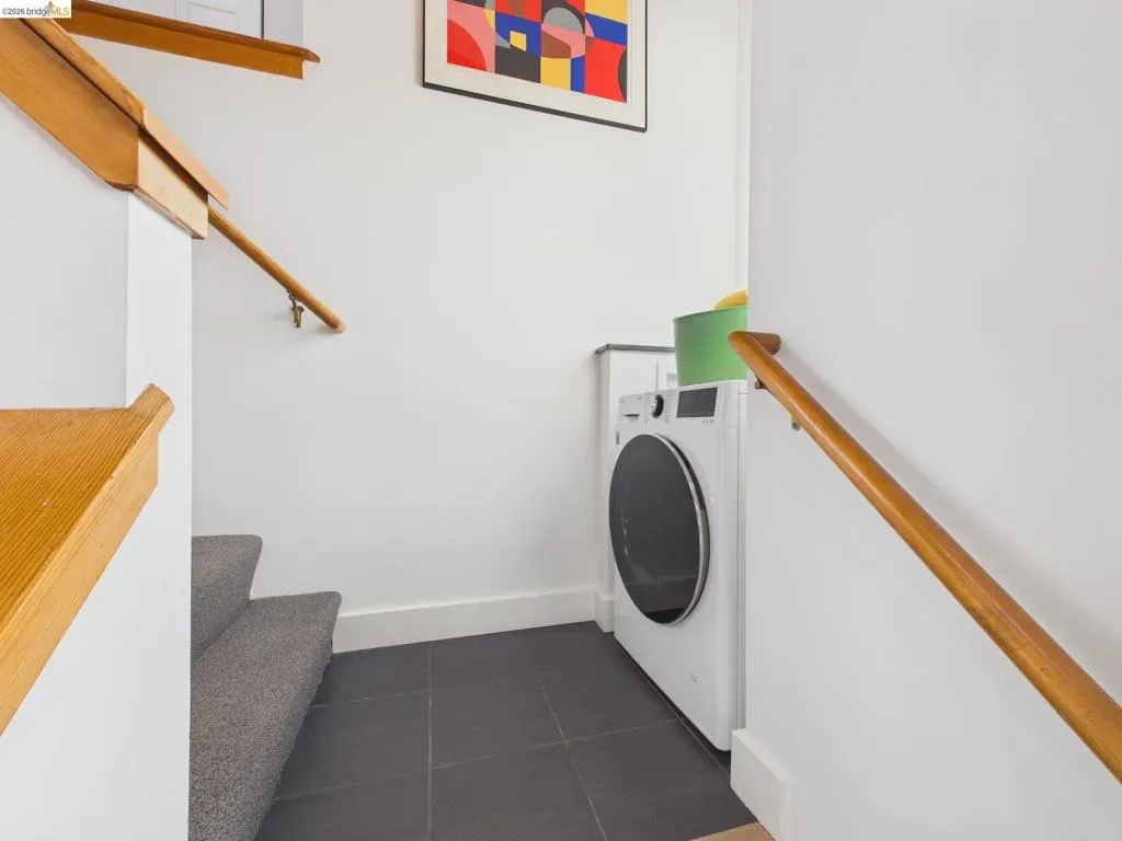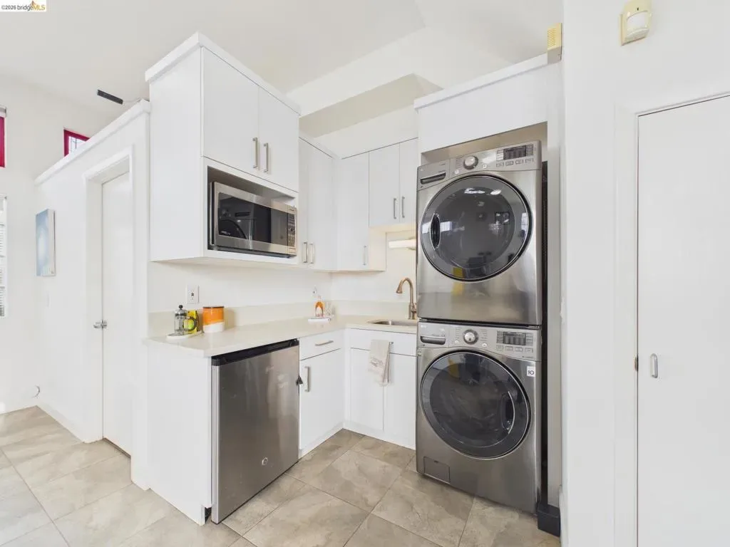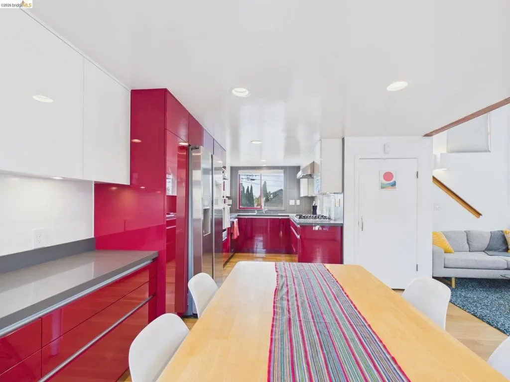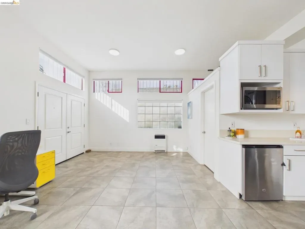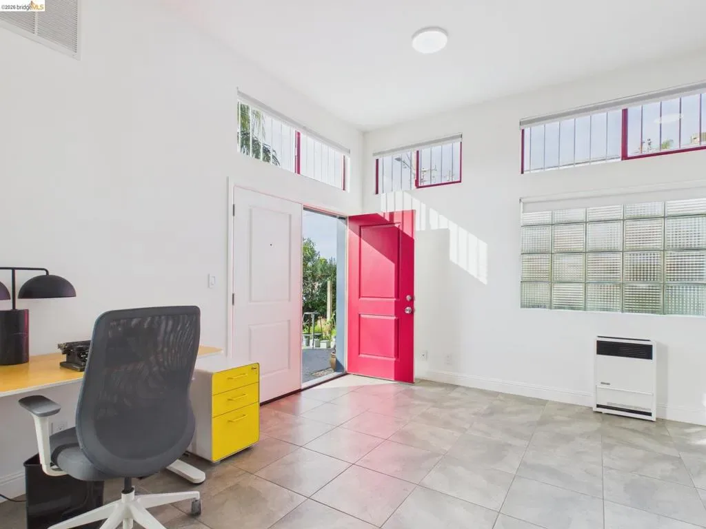 A rare fusion of Italian-inspired design and live/work functionality, this striking 1,636 sqft loft unfolds across three light-drenched floors in centrally located West Oakland. Soaring vaulted ceilings with exposed wood beam trusses set a dramatic stage — the kind of volume that invites creativity, complete with electrical connections in the rafters for studio or shop equipment. The showpiece kitchen dazzles with high-gloss crimson cabinetry, premium stainless appliances, and a chic dining space ideal for entertaining. Upstairs, the loft bedroom suite offers an intimate cathedral retreat with skylights and warm wood finishes. Two contemporary bathrooms feature porcelain tile walls and refined fixtures throughout. The flexible first-floor studio — with its own private entrance, kitchenette, and stacked laundry — functions seamlessly as a guest suite or creative studio. Outside, a lush shared courtyard with mature palms and a fountain creates a serene urban oasis.