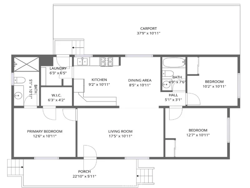 The home features a functional layout with a spacious living room, dedicated dining area, and a well-equipped kitchen with ample cabinetry and counter space. A large primary bedroom is thoughtfully positioned on the opposite side of the home from the second and third bedrooms, offering added privacy. An independent laundry room is designed for a side-by-side washer and dryer, adding everyday convenience. Central air conditioning provides year-round comfort.
