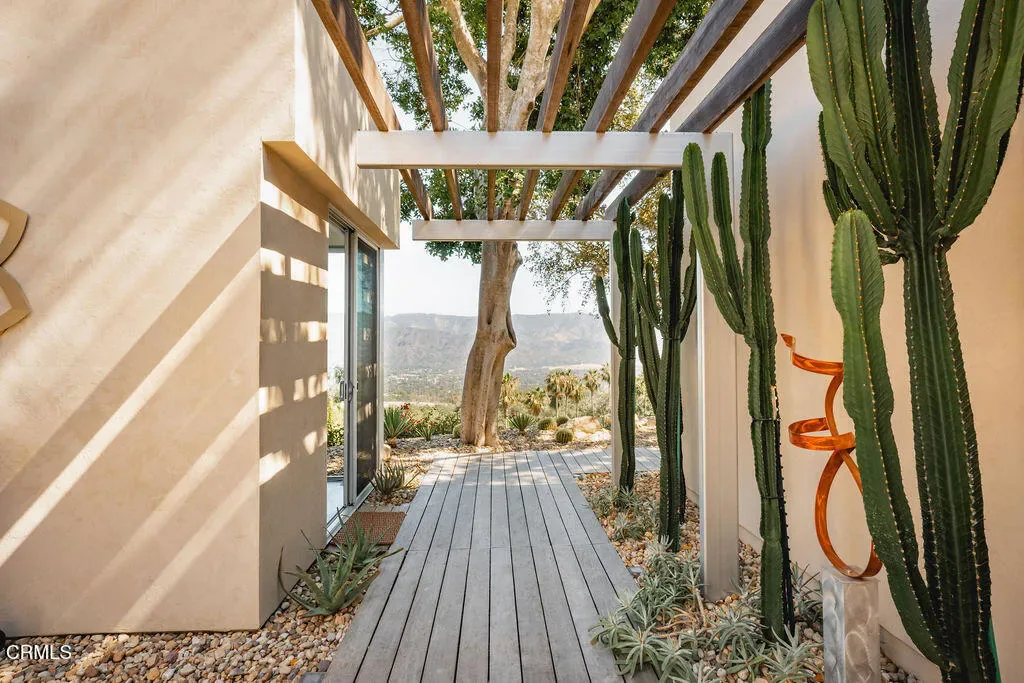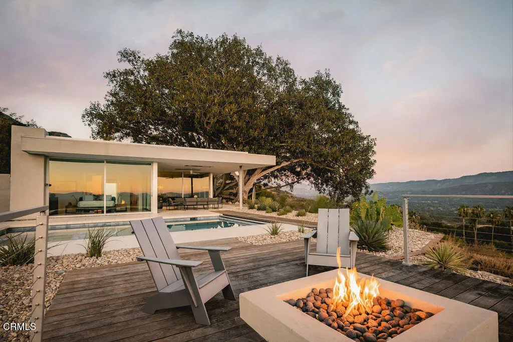The Glass House! Perched along Ojai’s iconic Foothill Road, this architectural retreat is a sanctuary of light, glass, and Zen-like serenity, an exquisite union of design and nature. Built in 2017, the single-level home spans 3,154 sf with walls of glass that dissolve the boundaries between indoors and out, framing an expansive 270-degree view of mountains, valley, and sky. Minimalist yet inviting, the interiors balance polished concrete floors with sculptural quartz surfaces, complemented by the landscape’s organic beauty, inspiring both stillness and creativity. Re-envisioned in 2022, the property was elevated with a 1,117-sf Pavilion, a modern addition featuring showcase-style parking with a private yoga and fitness studio, sauna, an inspired space where wellness and architecture converge. The main home transformation also added a media lounge and a fourth bedroom, enhancing versatility while preserving refined elegance. Two additional dwellings enrich the sense of retreat: a creative atelier, ideal for quiet work or writing, and an intimate leisure cabana, welcoming meditation, wellness, and relaxation. Together, these structures form an inspiring compound designed for reflection, connection, and balance. Set upon 1.87 acres shaded by magnificent Moreton Bay fig trees, the grounds unfold like a living canvas: a sparkling pool with spa, sun-dappled decks, a Tuscan-inspired courtyard for al fresco dining, and fire-lit terraces where Ojai’s legendary Pink Moment illuminates the horizon. From nearly every vantage point, the views are transcendent: fog drifting over ridges, sunsets spilling gold across the valley, and starlit nights that feel infinite. More than a home, this is a glass-walled sanctuary in the treetops, an architectural jewel and meditative Zen haven, offering one of Ojai’s most extraordinary perspectives. One Of A Kind.