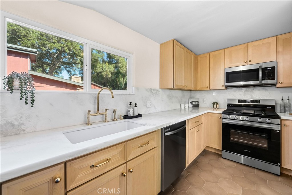 The interior is fresh and refined, featuring Bedrosians laminate flooring throughout and Bedrosians tile in the bathrooms, kitchen, and laundry. A custom kitchen by Best Sheer Stone serves as the centerpiece, with clean, contemporary finishes and new appliances, complemented by a stackable washer and dryer and custom glass shower enclosures. Every element has been curated to create a space that feels complete, functional, and easy to live in from day one.