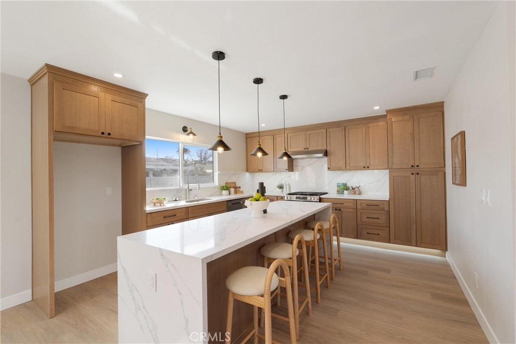 The fully updated kitchen features quartz countertops, custom oak cabinetry, stainless steel appliances, and a large island that flows seamlessly into the main living and dining areas, creating the perfect space for everyday living and entertaining.