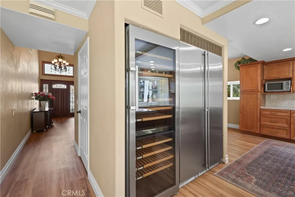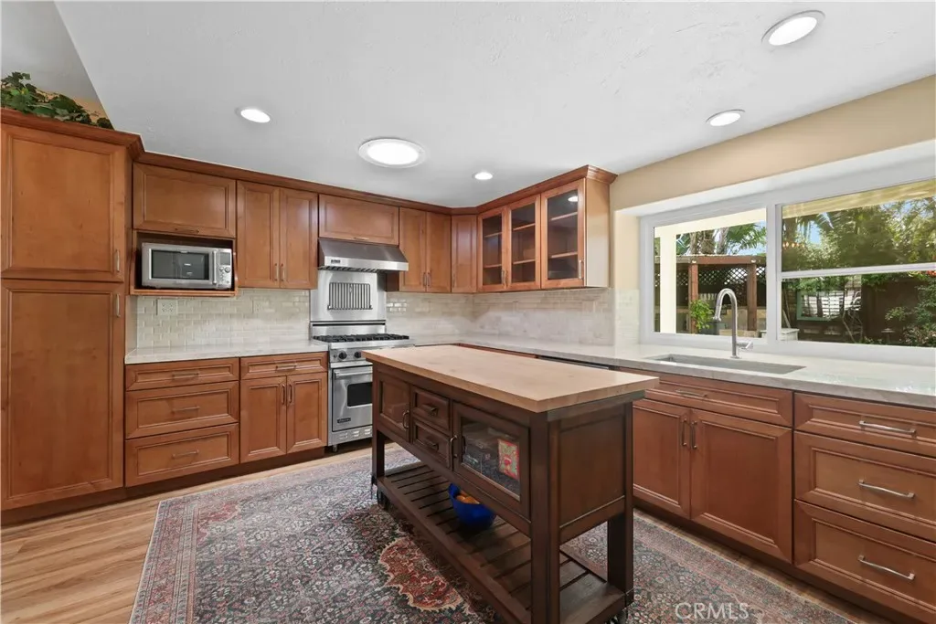 At the heart of the home is a fully remodeled chef’s kitchen, featuring rich wood cabinetry, a Viking gas range, stainless steel appliances, and premium quartzite heat-resistant countertops. The kitchen flows seamlessly into a spacious family room, making it perfect for everyday living and effortless entertaining.