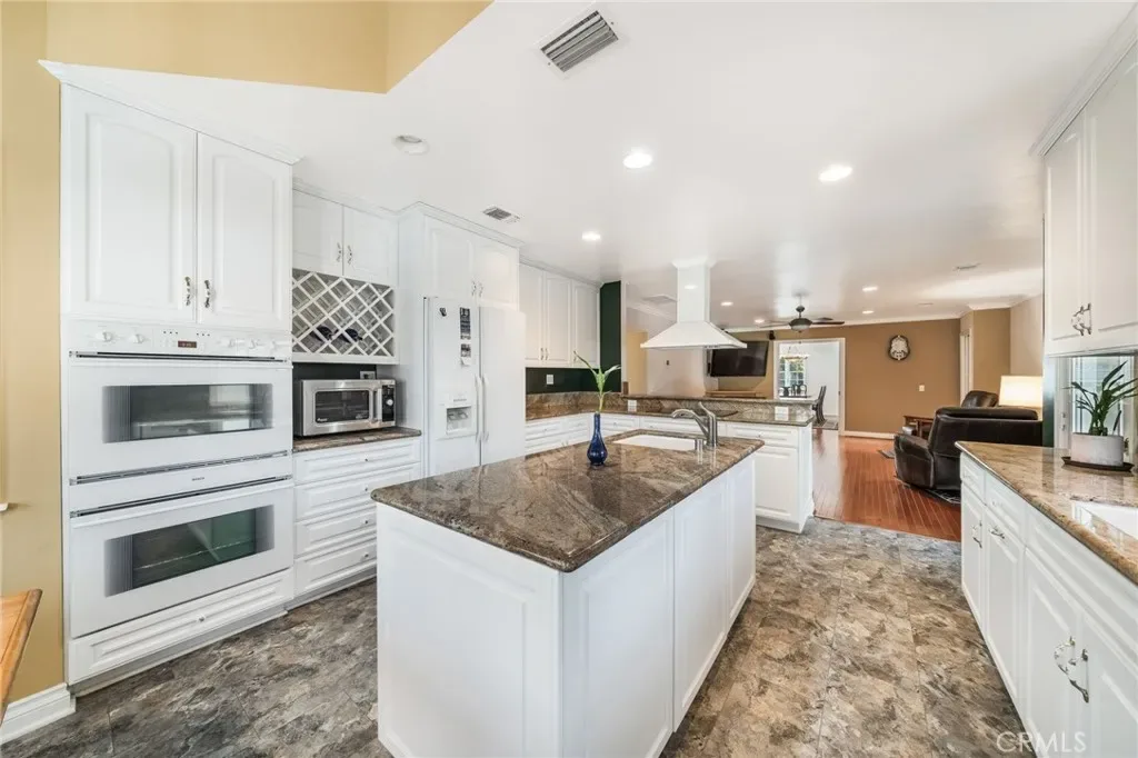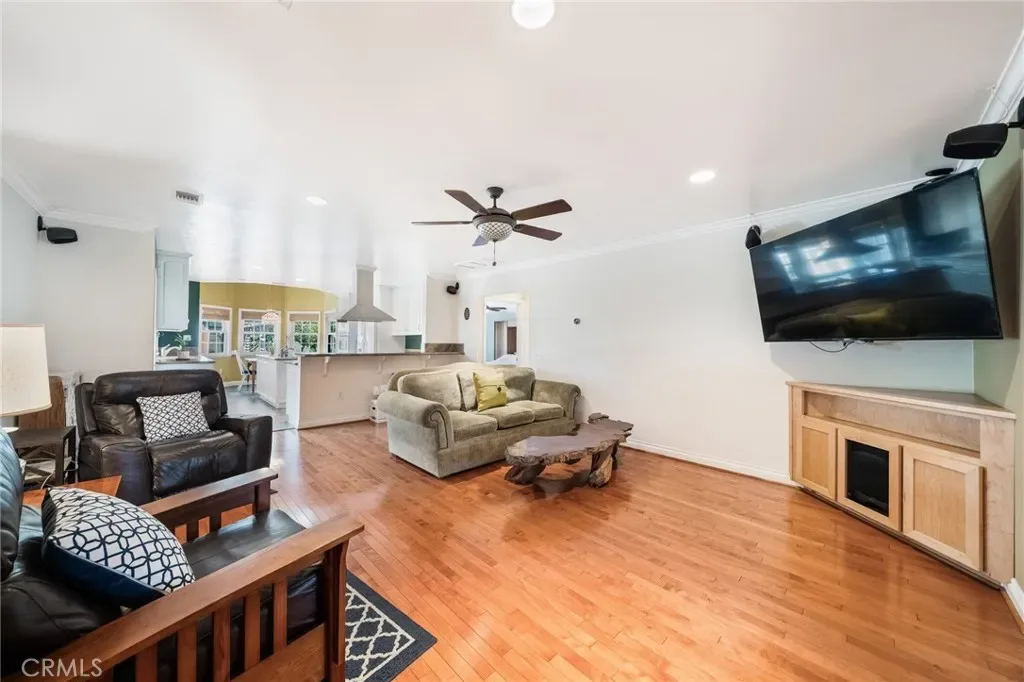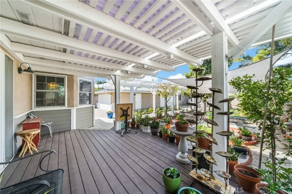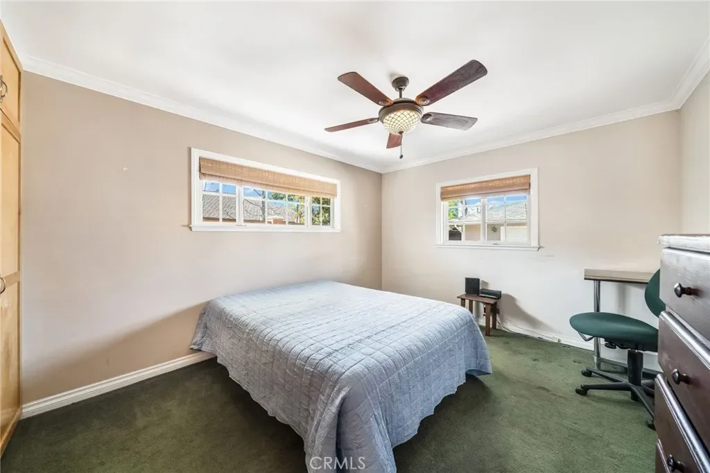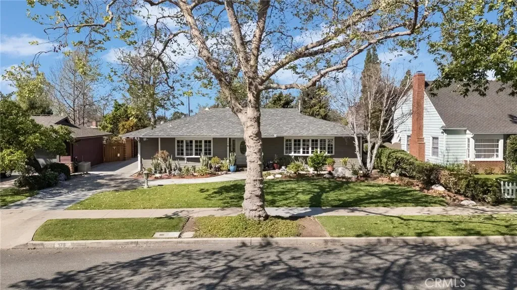 Welcome to the best street in Orange, a one-block tree-lined street, a short walk to Old Towne, and a short drive to all freeways. Known as the kibby house, this sprawling 4-bedroom 4-bath ranch home has charm and personality. The front yard is a display of color from the multiple flowerbeds, and mature trees accent the winding walkway into the house. A long driveway has pavered sections. gated parking leading to additional parking with a 2-car garage. Attached to the garage is an 830 sq. ft. workshop, adu, or game room featuring a custom tile 3/4 bath, vaulted ceilings with skylights, upgraded power, and garage access. The rear yard also has an additional shed for storage. The rear yard has a gazebo, covered patio, and trellis area to enjoy the flowers or pick from many fruit trees, including lemons, naval oranges, bananas, dragon fruit, papaya, and persimmon. If you need to make a fruit salad, there are 2 sinks, one double and one utility, located on the center island. clean up is easy with 2 dishwashers, one Fisher Paykel and a Bosch dishwasher. granite counters, custom cabinets, a double oven, and a refrigerator. an octagonal eating area with lots of windows for those everyday meals, or the dining room for the more formal occasions. open to the family room, a breakfast bar for those quick meals. a custom entertainment system to watch tv from wherever you dine. A formal living room features a masonry-built brick fireplace, perfect for those holiday gatherings. classic hardwood floors and a six bay front window to view the beautiful yard. The newer primary bedroom has a ceiling fan, crown moldings, and a French door with opening sidelights out to the patio, a perfect place to enjoy your morning coffee. The en suite bath has a custom tile and glass block shower, dual sinks, and a walk-in closet. two primary bedrooms, on the other end of the house, a bedroom that has been turned into an office, and a classic tub/tile bath. There is also a main bath for the other 2 bedrooms. dual zoned central heating and air conditioning to control the climate. Solar tube skylights to let the natural light shine in. All bedrooms have custom closets to be organized and maximize the storage space. There is also a utility basement that has the HVAC and the water heater down there for maybe future wine cellar. Just drive by, and you will experience the curb appeal that says welcome home. This is truly a one-of-a-kind custom-built home on a street that can not be beat.