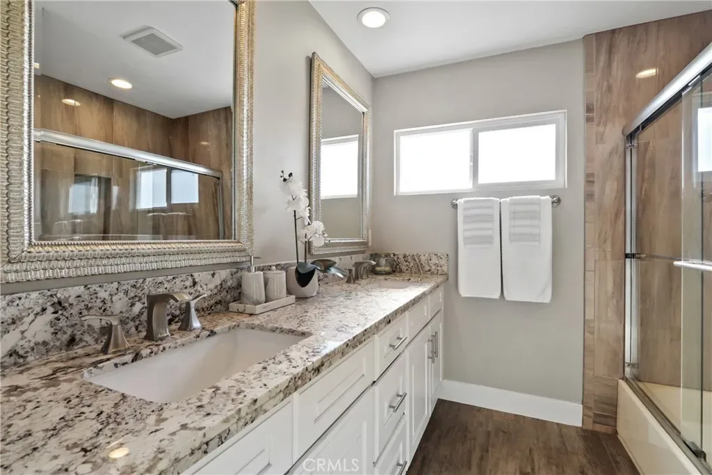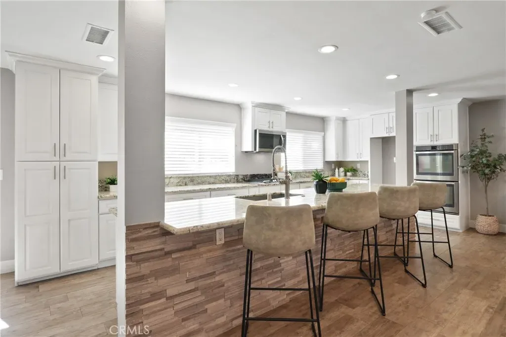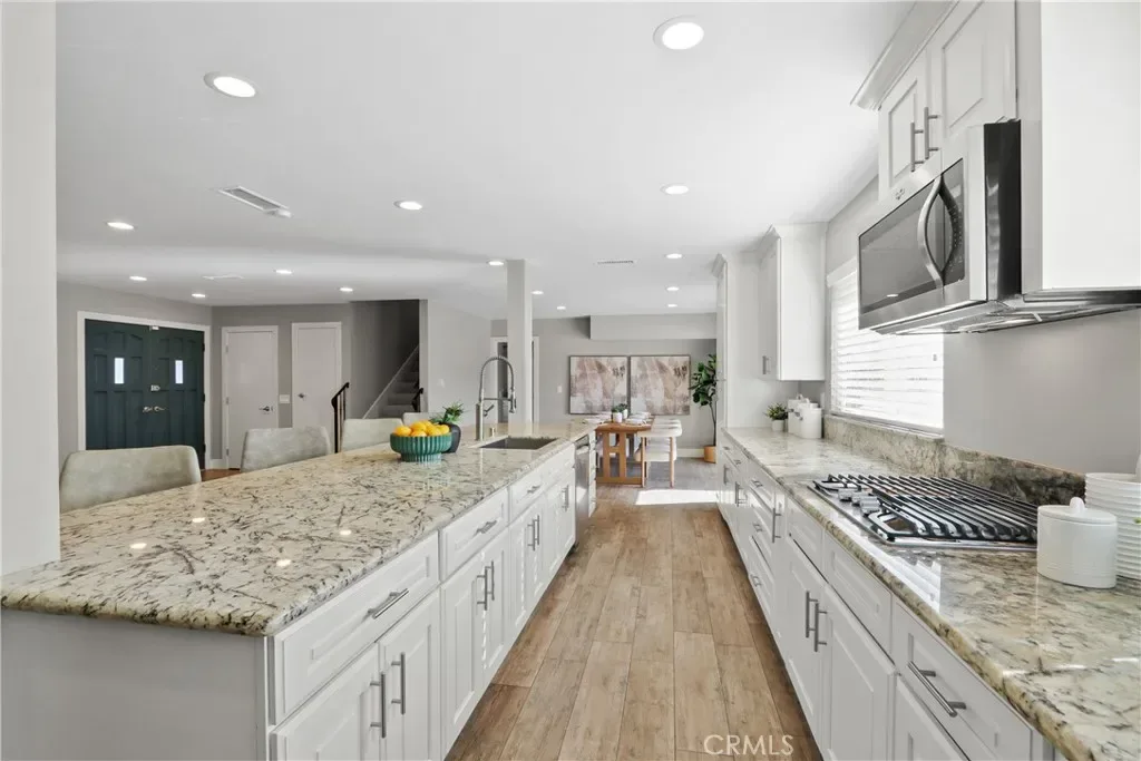 This beautiful 5-bedroom, 3-bath home offers a thoughtfully designed living space that has been completely remodeled throughout. Step through the double-door entry into an inviting open floor plan filled with natural light, where the living, dining, and kitchen areas all flow seamlessly together to create a warm and connected atmosphere. The showstopping 13-foot kitchen island is an impressive centerpiece featuring granite countertops and a stacked-stone accent finish—perfect for meal prep, hosting, or gathering. The updated kitchen offers soft-close cabinets and drawers, a built-in spice rack, pantry, granite countertops, stainless steel sink, and appliances which include a double oven, microwave, and gas cooktop. Custom wood-look tile flooring spans the entire main level. Double-pane windows enhance energy efficiency, while central A/C, heat and a whole house attic fan provide year-round comfort. The living room boasts a floor to ceiling custom stacked stone fireplace. Two spacious bedrooms are located on the main floor behind a private door, offering flexible living options for guests, workspace, or multi-use needs. The first-floor bathroom features a convenient walk-in shower. The laundry room includes a utility sink and plenty of storage. The entire interior has been freshly repainted for an updated and move-in-ready finish. Upstairs, brand-new carpet leads to three additional bedrooms, including a spacious primary suite with a walk-in closet and dual-sink vanity. Mirrored sliding closet doors are featured throughout. All bathrooms have been updated with beautiful mirrors, vanities, granite countertops, custom tile showers, and thoughtfully designed niches. At the top of the stairs you’ll find an additional closet and a large linen cabinet. The private backyard offers a peaceful retreat with two mature avocado trees providing shade and seasonal enjoyment—ideal for relaxing or entertaining. The property includes a detached 2-car garage, space to park two additional vehicles in front of the garage, and a 9.5-foot gate accommodating RV, boat, or trailer parking. Situated directly across from the scenic Santa Ana Riverbed biking trail—with access routes toward Newport and Huntington Beach as well as charming Old Town Orange. The home also provides easy access to the 91, 55, and 57 freeways, local schools including Fletcher Elementary (dual immersion program), Villa Park High School and Orange Lutheran High School are just minutes away.