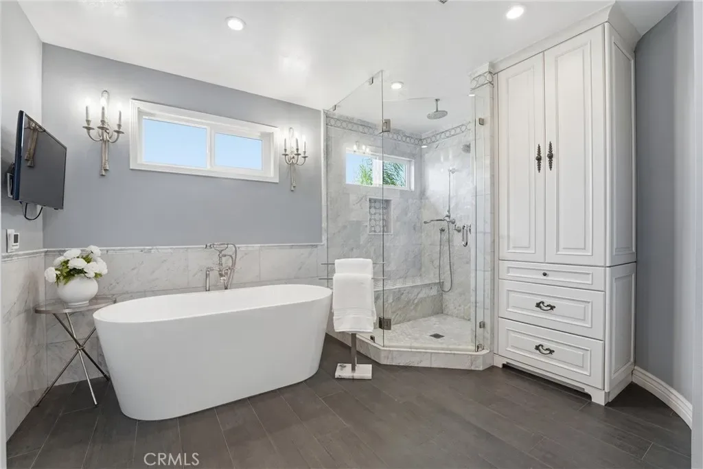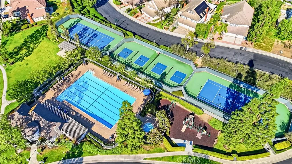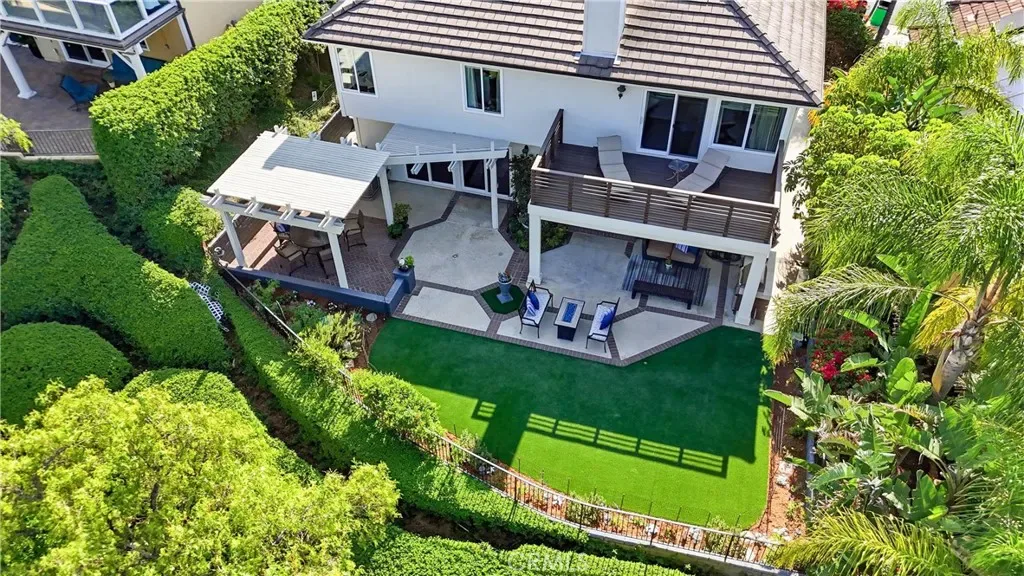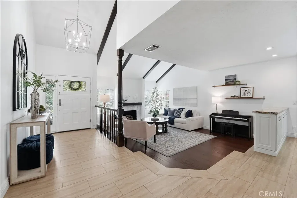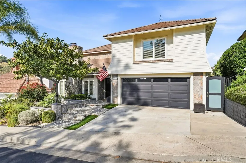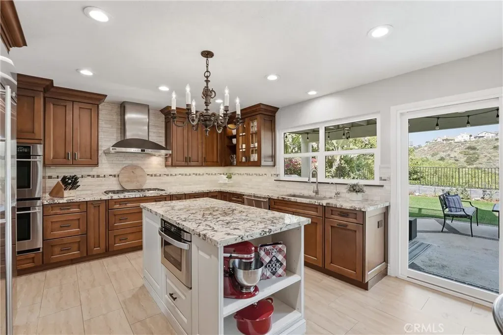Welcome to this remodeled single-family home located in the guard-gated community of Rocking Horse Ridge in Orange, offering canyon views, a private backyard, and a functional floor plan designed for modern living. Positioned on an elevated lot with no direct rear neighbors, this home combines privacy, natural light, and access to sought-after community amenities including a 24-hour guard gate, pool, spa, clubhouse, park, pickleball, and tennis courts. The interior features a remodeled kitchen with custom wood cabinetry, granite countertops, stainless steel appliances, and a center island that opens to the family room and backyard. Multiple living spaces include a formal living room and a separate family room with exposed wood beam ceilings, a stone fireplace, and wired surround sound. Real hardwood flooring and travertine tile run throughout, complemented by recessed lighting and all new interior paint. Additional upgrades include double pane windows, a whole house fan, and a full repipe completed by previous owners. The primary suite offers canyon views, a private balcony, fireplace, and ample space for a retreat-style setting. An optional fifth bedroom or loft provides flexibility for a home office, guest space, or additional living area. The backyard is designed for both entertaining and everyday use, featuring a covered patio with lighting, built-in BBQ, seating areas, artificial turf, and a new irrigation system (2025). A fenced dog run adds additional functionality. The elevated lot enhances both privacy and view orientation. Additional features include an epoxy-coated garage floor with custom cabinets and workbench (2025). Located near Peters Canyon Regional Park, Irvine Regional Park, and local hiking and biking trails, with convenient access to shopping, dining, and major commuter routes.