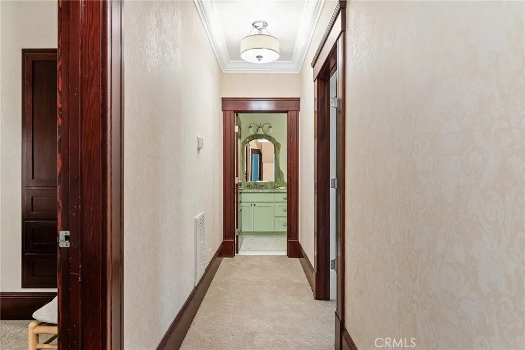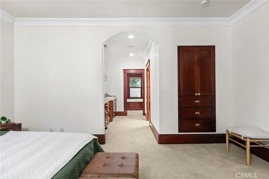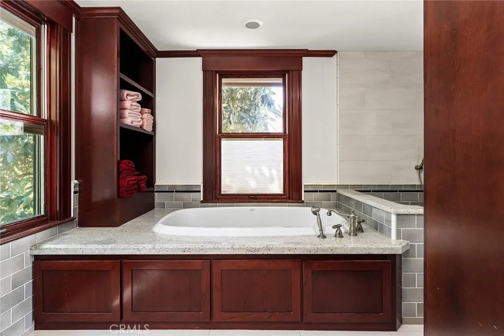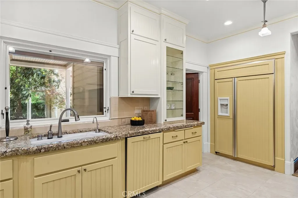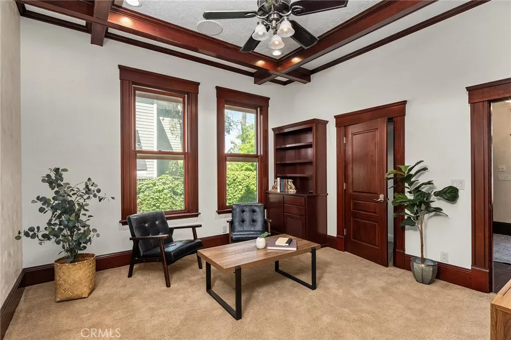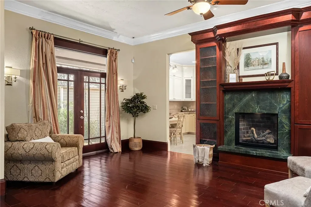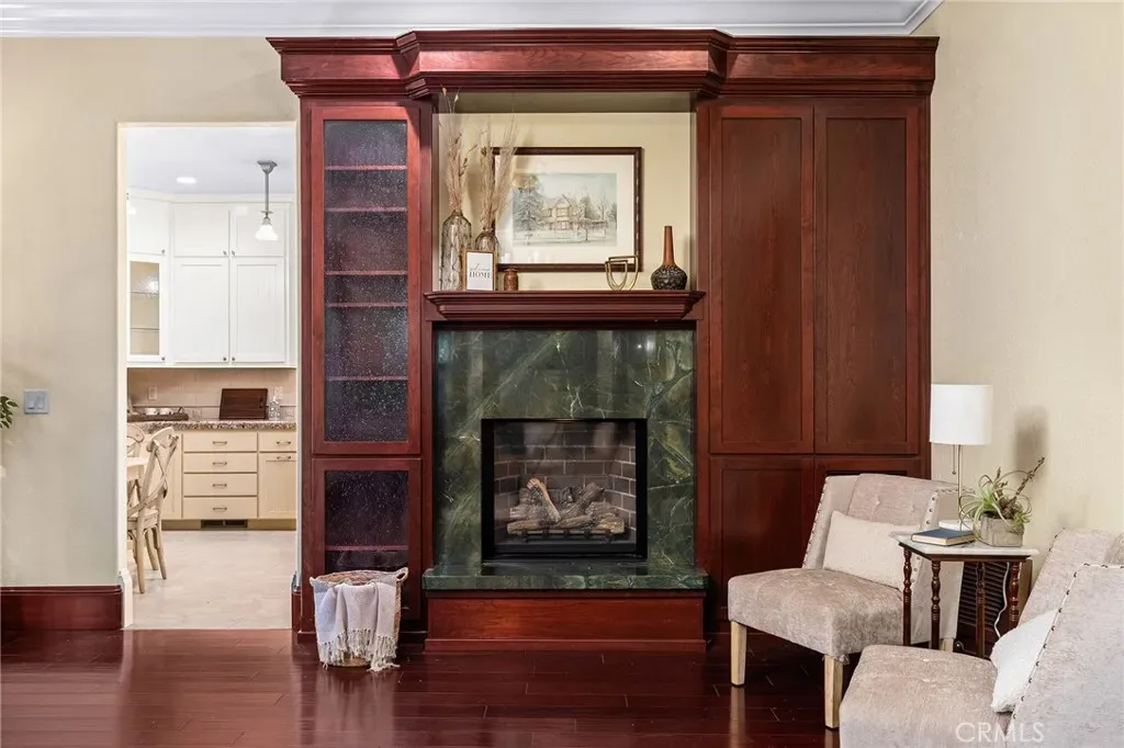 Inside, you’ll find a thoughtfully designed layout with a gourmet kitchen equipped with a built-in refrigerator, Monogram gas stove with a built in grill, and double ovens—perfect for entertaining. The inviting living room anchored by a statement gas fireplace is one example of how the home’s character shines through in every detail.
