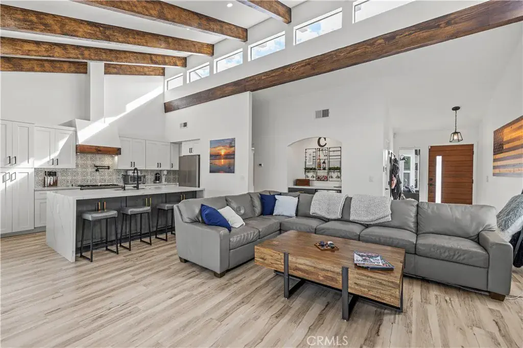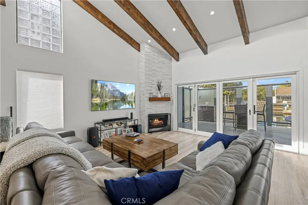 The interior is flooded with natural light courtesy of soaring beamed ceilings and strategically placed skylights. The open-concept living space features designer flooring and unique indoor-outdoor integration using modern bi-fold doors that open to an expansive waterfront deck and private dock. At the heart of this home sits a gourmet chef’s dream kitchen equipped with high-end appliances, a sleek waterfall countertop, and an oversized center island with breakfast bar seating—perfect for entertaining while taking in the unforgettable views.