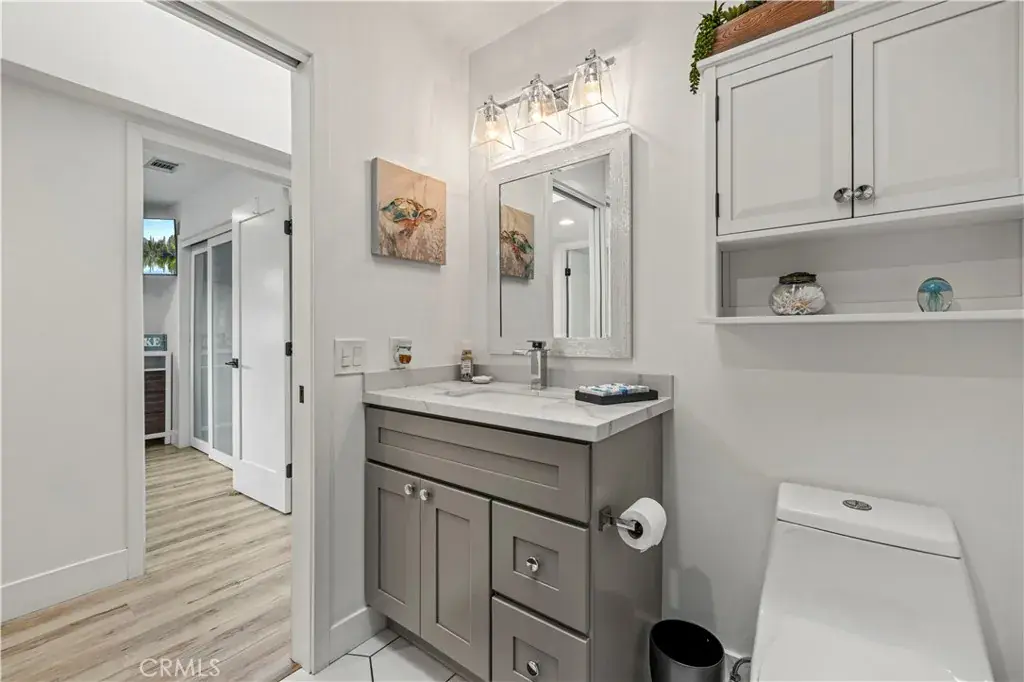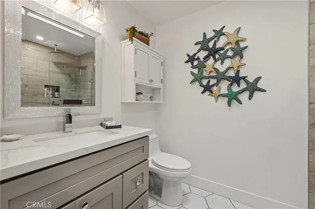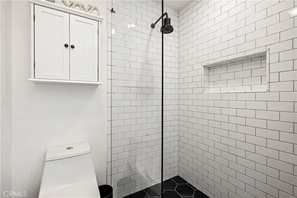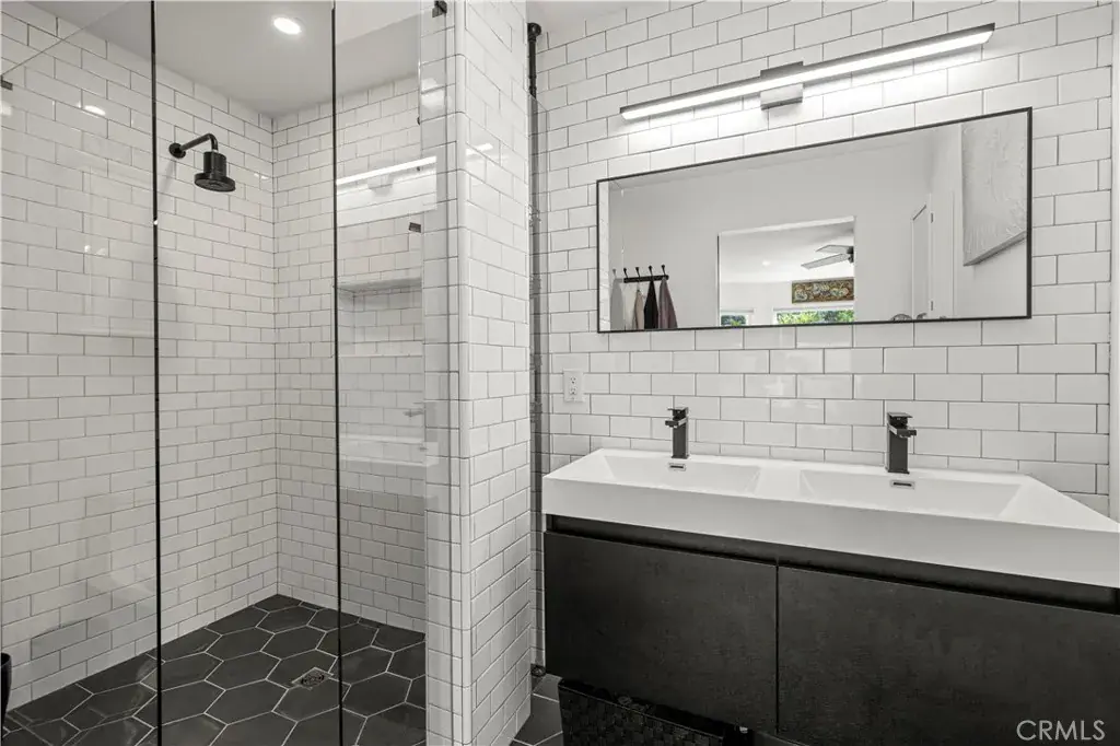 The residence offers two spacious bedrooms and two full bathrooms. The primary suite serves as a private sanctuary, boasting a spa-inspired bathroom with a floating double vanity and a frameless glass walk-in shower featuring dual shower heads.