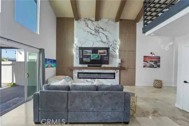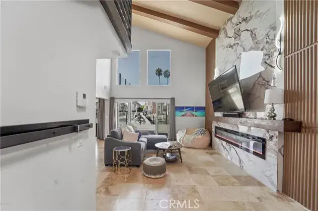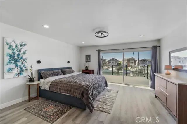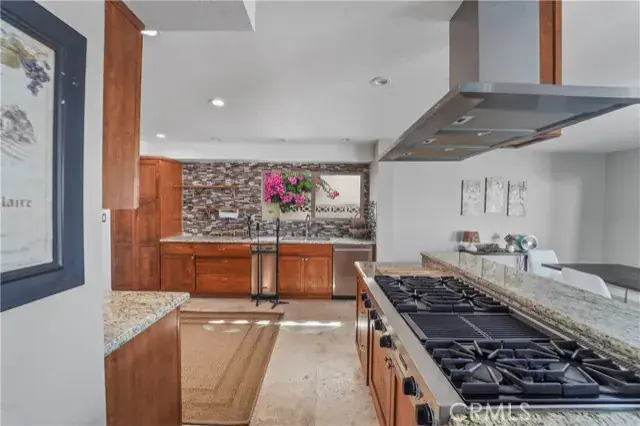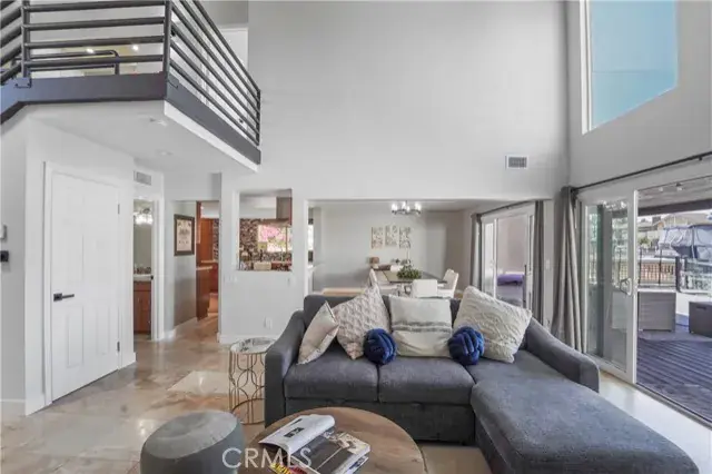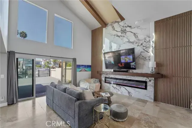 The main level offers a bright and spacious living room with vaulted ceilings, designer chandeliers, elegant travertine flooring, a sleek modern fireplace, and two large sliding glass doors that fill the home with natural light while showcasing stunning water views. The gourmet kitchen is appointed with a Viking cooktop, granite countertops, stainless steel appliances, and water views—perfect for both cooking and entertaining. A convenient half bath completes the downstairs layout.