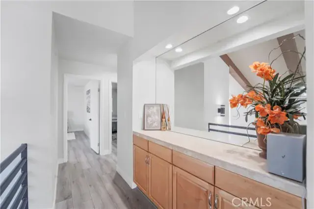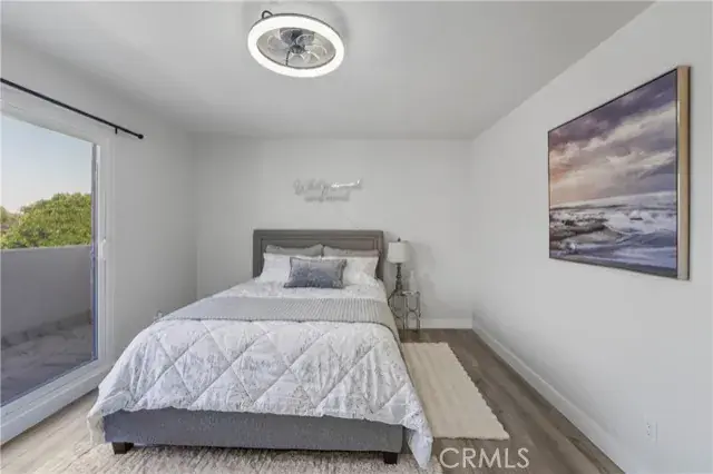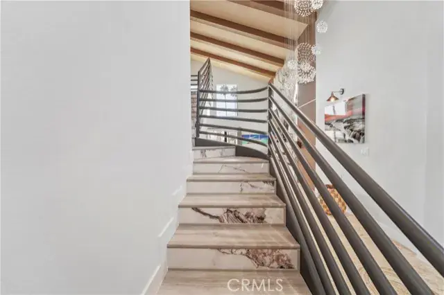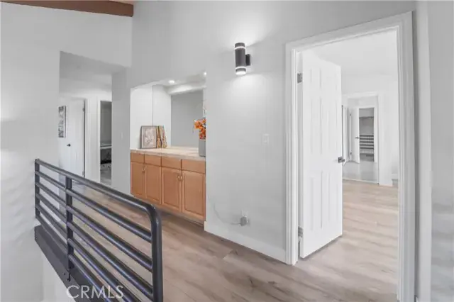 Upstairs, a contemporary metal staircase leads to three bedrooms with waterproof vinyl plank flooring. The primary suite boasts a private balcony, spa-like bathroom with soaking tub, separate shower, and abundant natural light. Down the hall, two additional bedrooms share a remodeled bathroom, with one bedroom offering its own private balcony.