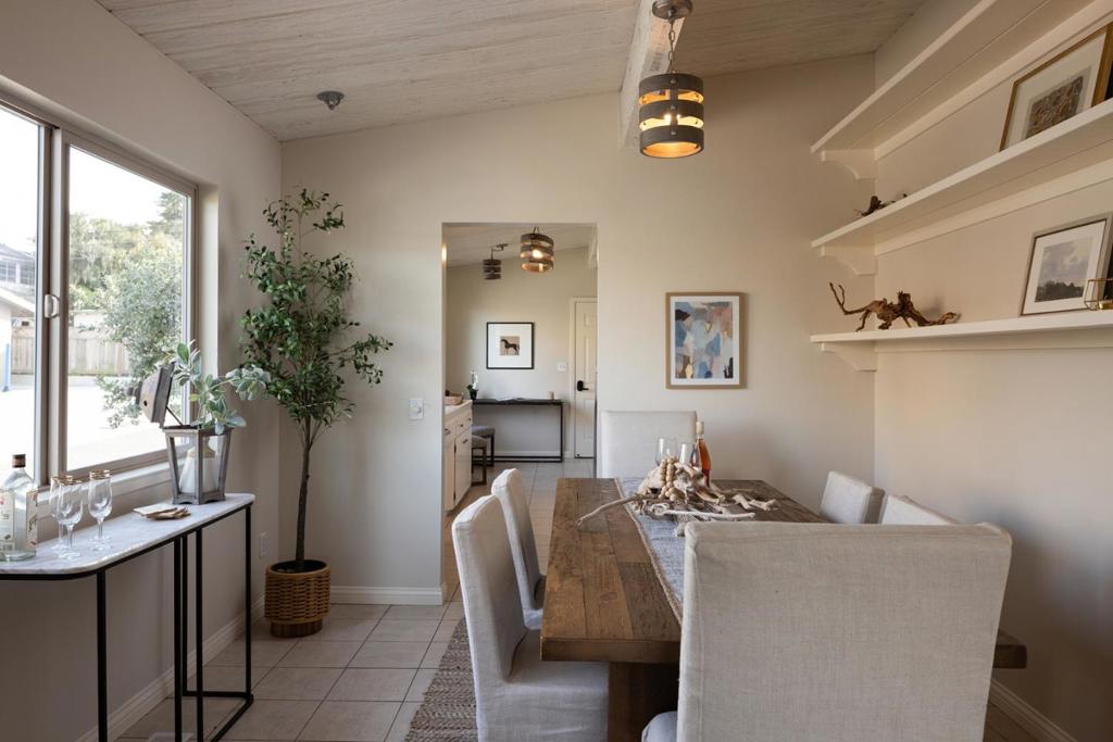 This charming single-level residence is set in a desirable, centrally located Pacific Grove neighborhood, just minutes from downtown, local schools, and the coastline. The 1,352 square foot layout includes three bedrooms and two bathrooms arranged with an easy, natural flow. Wood-laminate flooring runs throughout the main living areas, while the living room is highlighted by vaulted, open-beam ceilings and a wood-burning fireplace with a gas starter. Recent updates include fresh interior paint, a remodeled hall bathroom, and a newer composition shingle roof. The 4,100 square foot lot features an oversized detached two-car garage with ample space for storage or a workshop, along with a backyard deck for outdoor enjoyment. This is a well-maintained home in a location that captures the best of Pacific Grove living.