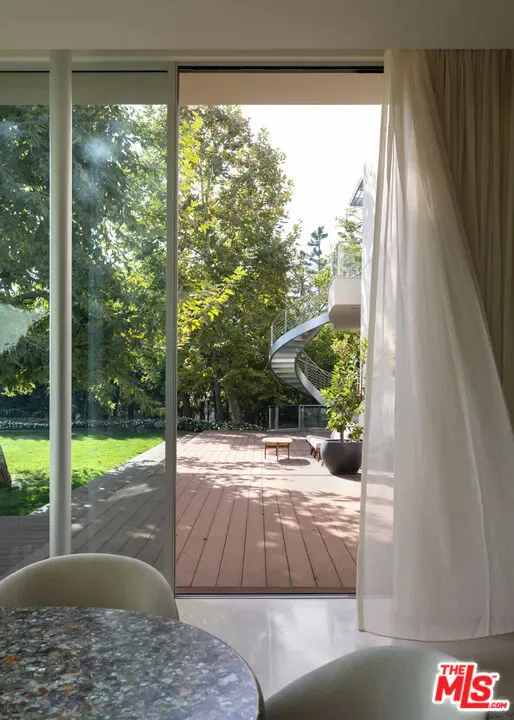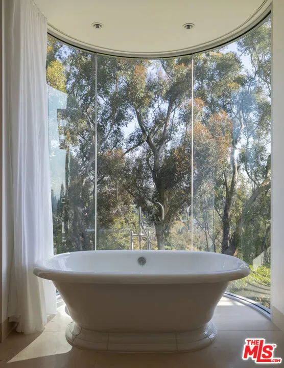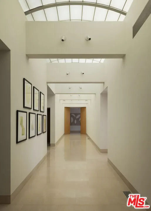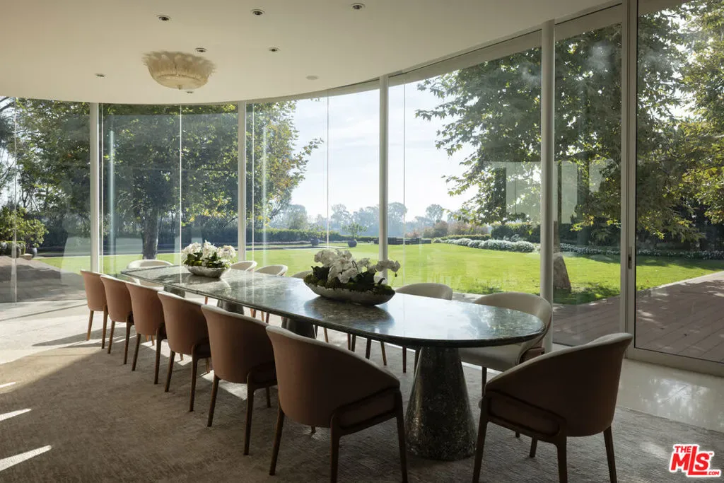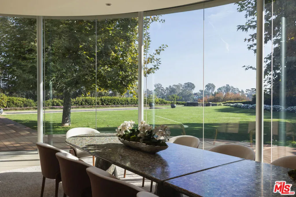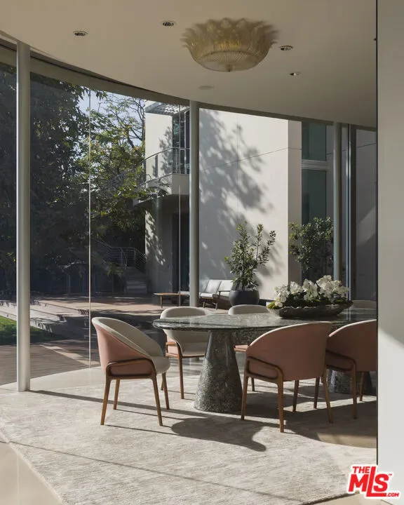 Museum Modern in Prime Huntington Palisades. Over 1.36 acres of verdant grounds, with views to the ocean, this rare offering is a world apart. A rare masterpiece, this private, double-gated estate was envisioned by Richard Keating, brought to life by Steven Giannetti and framed by lush landscaping by Calvin Abe. Monumental in scale yet warm in design, this 4 bedroom + staff suite residence offers nearly 14,645sqft of interior space with sweeping views from the canyons to the Pacific Ocean. Soaring 26-foot ceilings, palatial gallery-style corridors and walls of glass establish a museum-quality backdrop perfect for both art and architecture. Pristine white walls and expansive volumes are balanced by intimate, texture-rich spaces that invite daily living. A dramatic two-story foyer introduces luminous entertaining spaces, including a glass-wrapped formal living room with a unique water feature visible beneath a glass floor bridge at the entrance, a generous formal dining room curved in glass and a stylish lounge with custom bar and fireplace. The gourmet kitchen boasts upgraded appliances, bar seating and a striking marble island, blending culinary artistry with effortless entertaining. The “Blue Room” offers a stylish retreat with fireplace and bespoke bar, seamlessly suited for a media room, evening cocktails or quiet relaxation. Upstairs, the sleeping quarters unfold with elegance. The primary suite is a sanctuary with a sitting room, floor-to-ceiling windows, dual spa-style baths, oversized dressing rooms and an ocean-view terrace. Three additional guest suites, including a junior primary and one currently used as a gym, are complemented by a refined office with custom built-ins and terrace access. The grounds feature alfresco terraces with fireplaces and heat lamps, garden pathways, fruit trees and a fire-pit ocean lookout, while a lap pool with spa, towering sycamores and water features create a serene, elegant setting. Additional luxurious amenities include main-floor staff quarters, a private Venetian-inspired 10,000-bottle wine cellar with tasting room, a large motor court and a three-car garage. 652 Chautauqua stands among Pacific Palisades’ most significant contemporary estates, designed for collectors, entertainers and aesthetes alike.