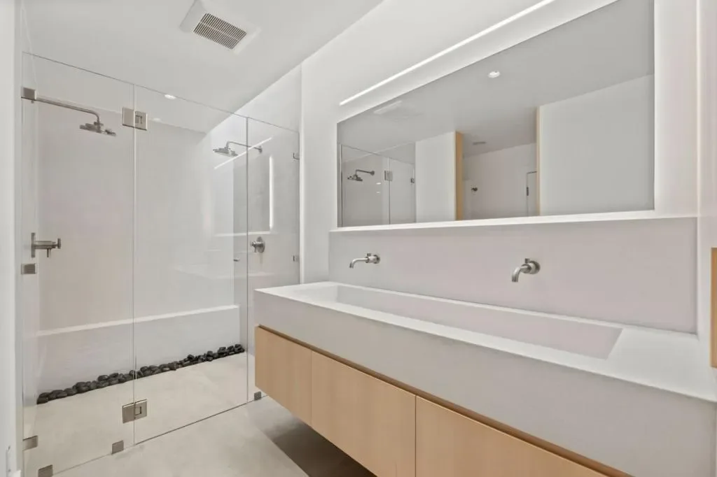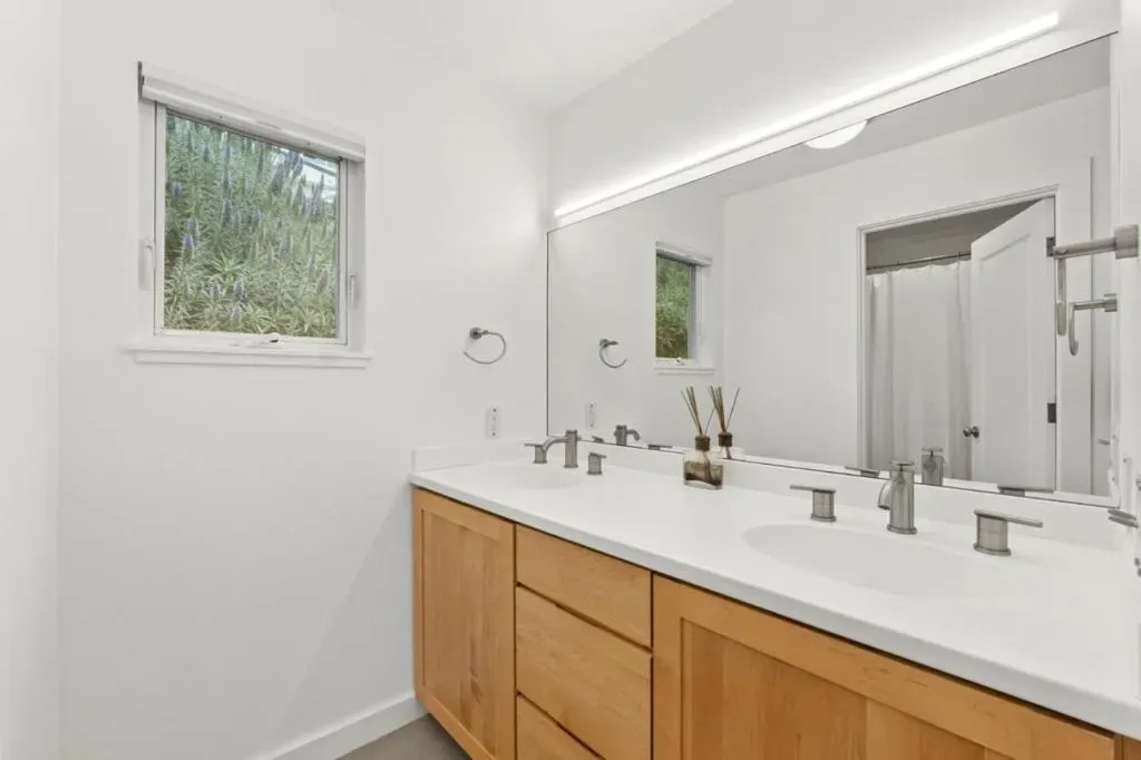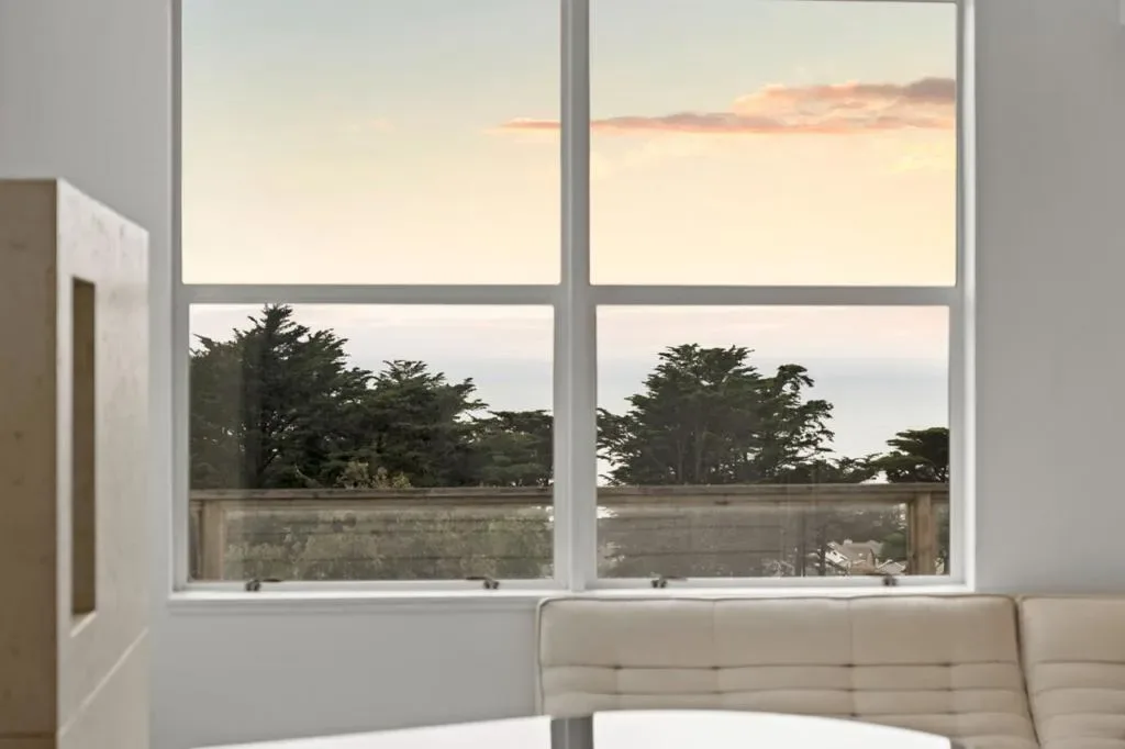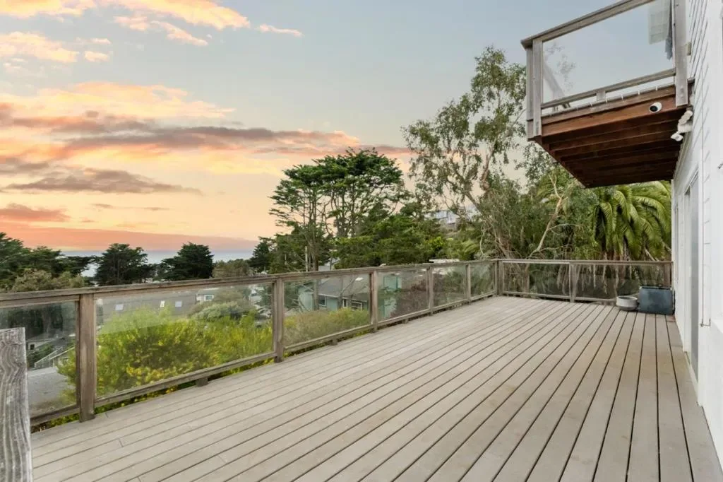 Breathtaking ocean views complement a modern residence designed to inspire calm and ease. Natural materials, sculptural stone, and wide-plank wood flooring create a grounded sense of quiet luxury, supported by impeccable craftsmanship throughout. Indoor and outdoor living blend effortlessly, shaping a home that feels both private and welcoming. Designer Buster + Punch hardware, rectified porcelain tile, and a genuine wood-burning fireplace and furnace add warmth and intention to every space. The chef’s kitchen is refined and functional, featuring waterfall Taj Mahal quartzite countertops and a full suite of Thermador appliances. Floor-to-ceiling windows draw in natural light and frame sweeping ocean views. The primary suite offers custom white birch paneling and a spa-inspired bath featuring a dual walk-in shower and custom sink beneath a skylight. The additional bathrooms continue the same thoughtful approach, pairing clean modern fixtures with artisanal finishes such as Italian limestone walls and touchless bidets. Three ocean-view decks unfold across the property, creating a rare, layered outdoor experience. A massive crawl space with seven-foot ceilings provides exceptional storage. 15 min to San Francisco & SFO Airport