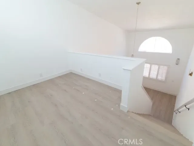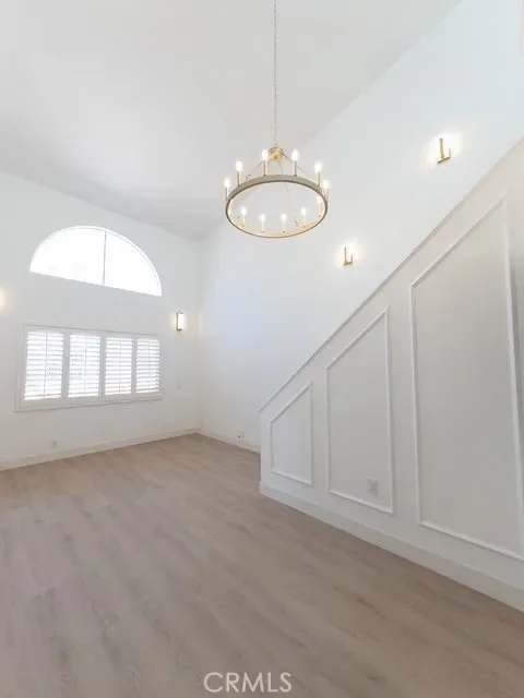 The spacious living room offers soaring ceilings, abundant natural light from large windows, and a charming loft that adds both character and functionality. Custom molding accents the staircase walls, kitchen area, and loft wall, adding a refined touch throughout the home.