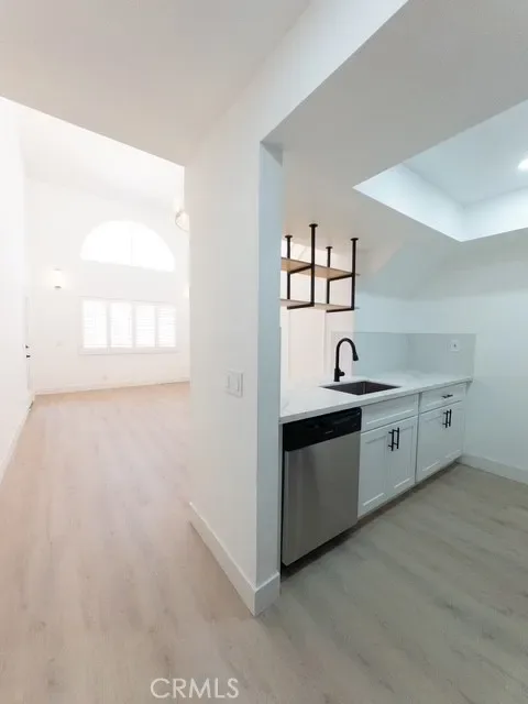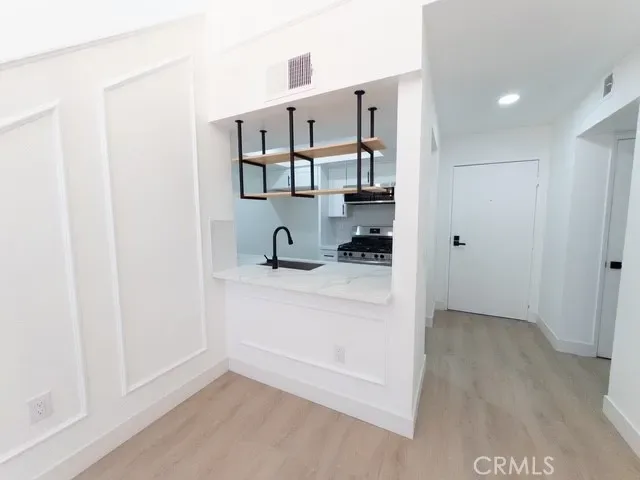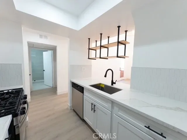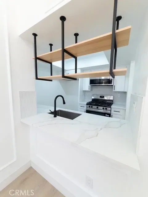 The modern kitchen showcases premium quartz countertops, an elegant backsplash, brand-new cabinetry, and a sleek contemporary sink paired with a high-end microwave and faucet. Stylish hanging shelves above the sink provide additional storage, perfect for displaying wine glasses.