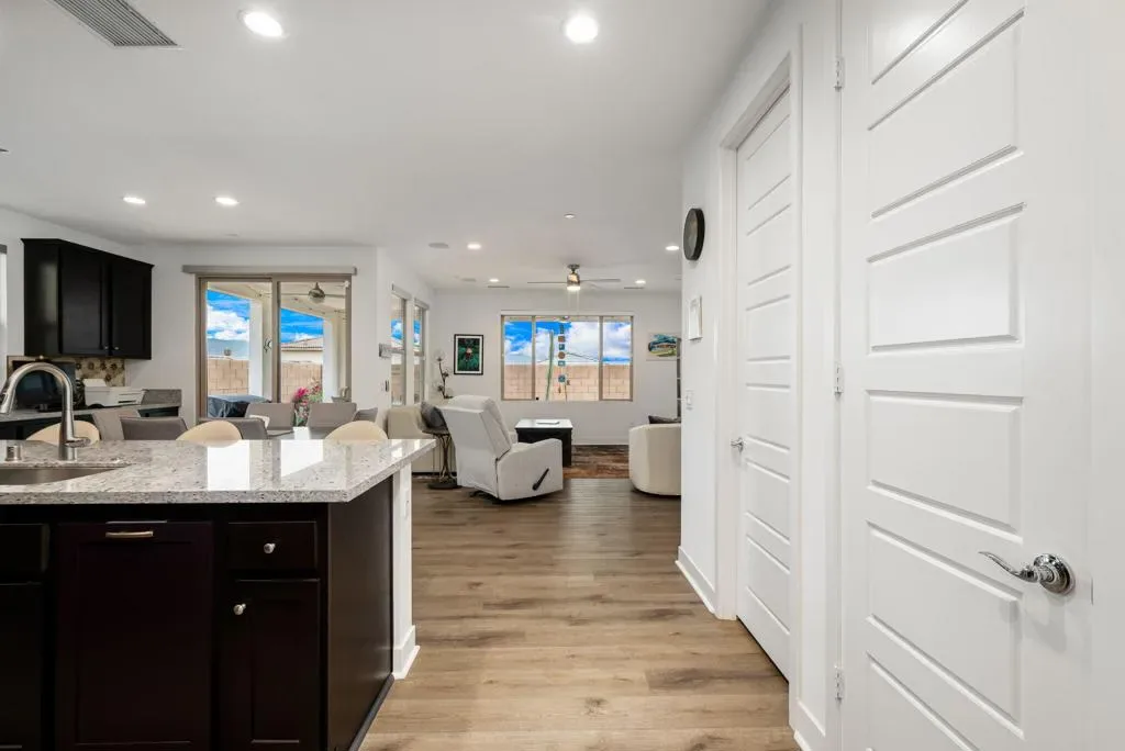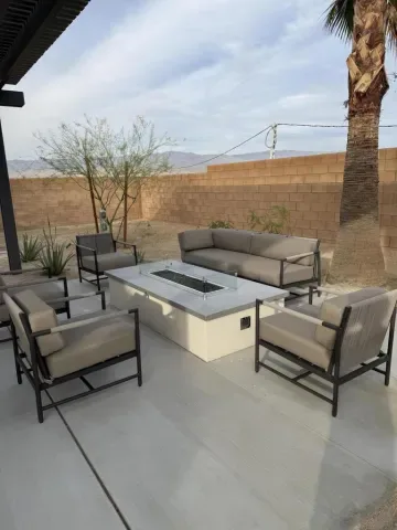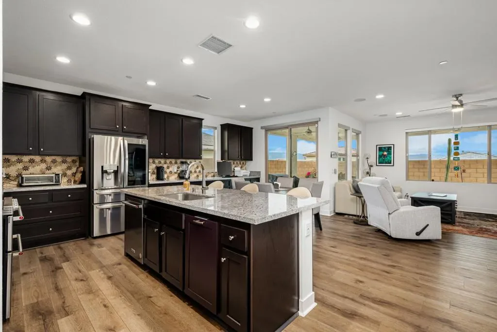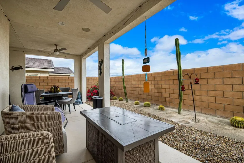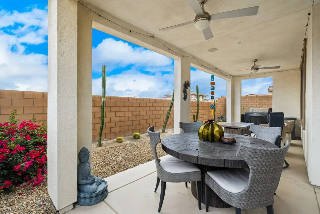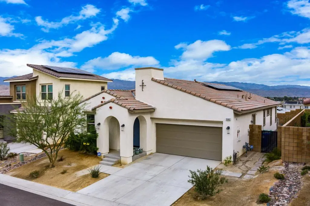 Owned Solar and all furnishings available! Seller is motivated. Welcome to Sage Palm Desert! Built in 2021 by Ponderosa Homes, this beautifully maintained single-story residence offers the benefits of newer construction without the wait. With the option of being fully furnished, this home provides a move in ready experience. The thoughtfully designed 3-bedroom floor plan showcases warm tones and modern finishes throughout. The open-concept living area flows seamlessly into a spacious kitchen featuring upgraded stainless steel appliances and a large island–ideal for both everyday living and entertaining. The large private primary suite features backyard views, dual vanity sinks, and a generous walk-in closet. Additional highlights include vinyl wood-look flooring, marble countertops in the kitchen and bathrooms, extended kitchen cabinetry, Milgard windows, new window coverings, and electric vehicle charging in the garage. Enjoy OWNED SOLAR for energy efficiency and low electric costs, along with a smart home system and wired alarm. Peek-a-boo mountain views from the main living area and patio elevate the living space. The backyard is designed for year-round enjoyment with a wraparound covered patio, ceiling fans, and low-maintenance landscaping. Sage Palm Desert is a gated community featuring a completed resort-style clubhouse with a pool, spa, and fitness center, offering a true desert lifestyle. Seller is willing to sell the home furnished or unfurnished making it a great second home or investment opportunity!