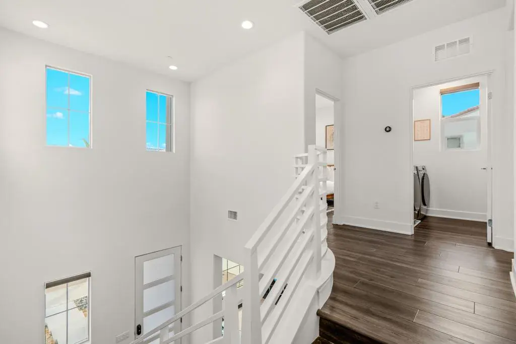 A study in modern desert elegance, this residence in Palm Desert’s sought-after University Park community presents a seamless blend of clean architectural lines and vibrant contemporary design. The entry makes an immediate statement, as a dramatic staircase rises beneath soaring ceilings, its clean-lined railing tracing a bold architectural silhouette. Hardwood-style plank flooring grounds the main level, where linear sightlines and curated contrasts define the open-concept living spaces. The great room is both sophisticated and inviting, illuminated by sculptural LED lighting and seamlessly connected to the outdoors through broad expanses of glass. At the heart of the home, the kitchen makes a bold yet elegant statement. Striking black marble countertops anchor the space, complemented by stainless steel appliances and a streamlined breakfast bar island. Also on the main level, a flexible den currently styled as a game lounge offers versatility, ideal as a media room, creative studio, office, or additional gathering space. The 2nd level is entirely devoted to privacy and retreat. All four bedrooms are thoughtfully positioned upstairs, including a detached casita-style suite, uniquely elevated for added separation and quiet. A centrally located laundry room on the upper level adds practical refinement to daily life. Outdoors, the experience shifts to resort mode. A private pool and spa shimmer beneath expansive desert skies, framed by patio spaces designed for alfresco dining, sun soaked afternoons, and twilight gatherings. Life at University Park extends beyond the home itself, residents enjoy access to The Grove, a vibrant community hub featuring multiple resort pools and spas, pickleball and bocce courts, a fitness center, playground, outdoor cooking areas, and expansive event lawns. Moments from premier shopping, dining, golf, and parks, this home offers a refined yet effortless desert lifestyle. Home is being sold furnished and includes an owned solar system.