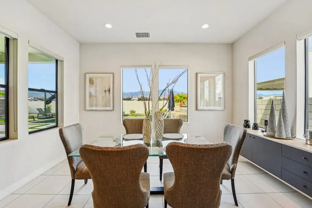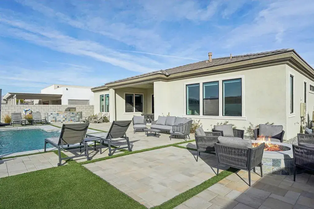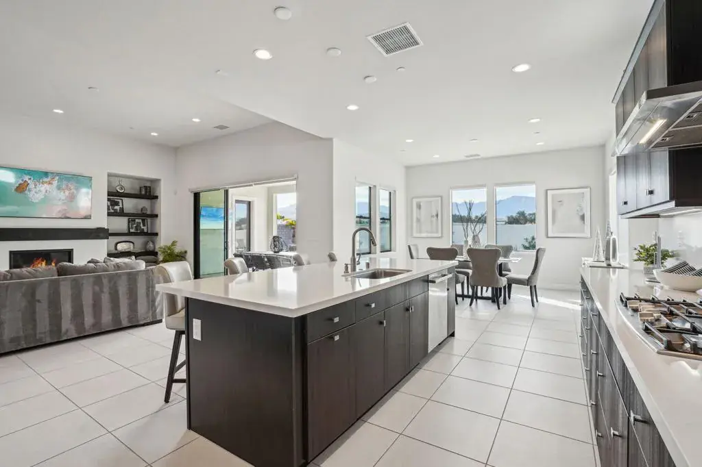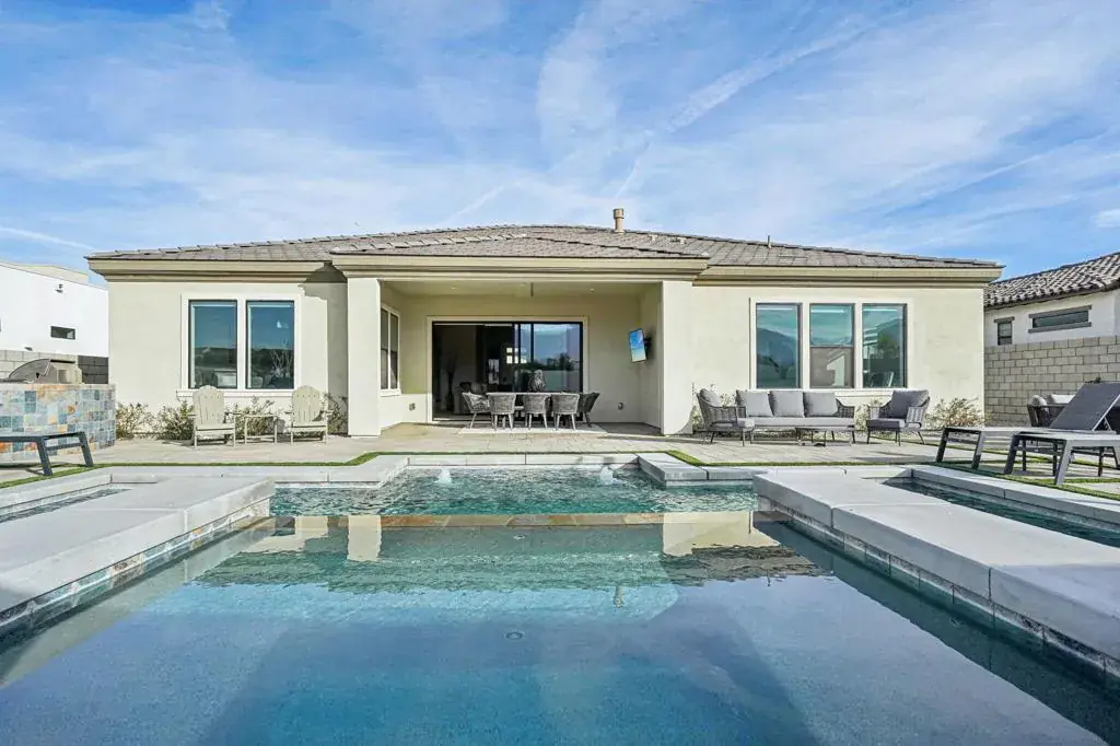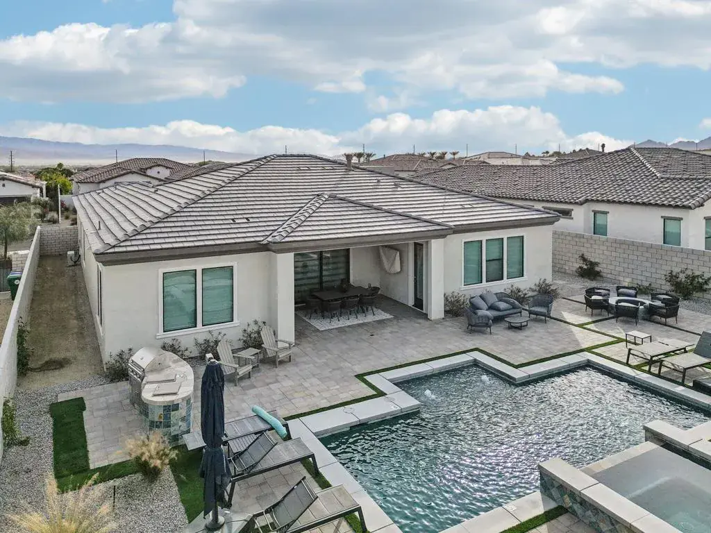 Experience refined desert living in the prestigious Montage community of Palm Desert. This upgraded 5-bedroom, 5.5-bath residence spans 3,251 square feet of thoughtfully designed open-concept living, where soaring ceilings and walls of glass invite abundant natural light and seamless indoor-outdoor flow.The chef’s kitchen anchors the home with granite countertops, upgraded cabinetry, stainless steel appliances, and an oversized island designed for gathering. Multiple entertaining spaces transition effortlessly to the backyard, creating an ideal setting for hosting or relaxing in privacy.Each bedroom offers a private en-suite bath, ensuring comfort and separation for family and guests alike. The attached casita — complete with its own entrance, wet bar, refrigerator, and full 3-piece bath — provides exceptional flexibility for visitors, extended stays, or a private office retreat.The resort-style backyard captures the essence of desert living, featuring an upgraded pool and spa, a built-in firepit, and a BBQ station — all designed for privacy and open-sky exposure, with distant mountain peaks providing a warm desert backdrop at sunset, perfect for evening gatherings and seasonal entertaining.Additional highlights include owned solar, a 3-car garage, low HOA, and the convenience of being offered fully furnished. Whether as a full-time residence, seasonal escape, or income-producing investment, this Montage property delivers comfort, flexibility, and elevated desert living.