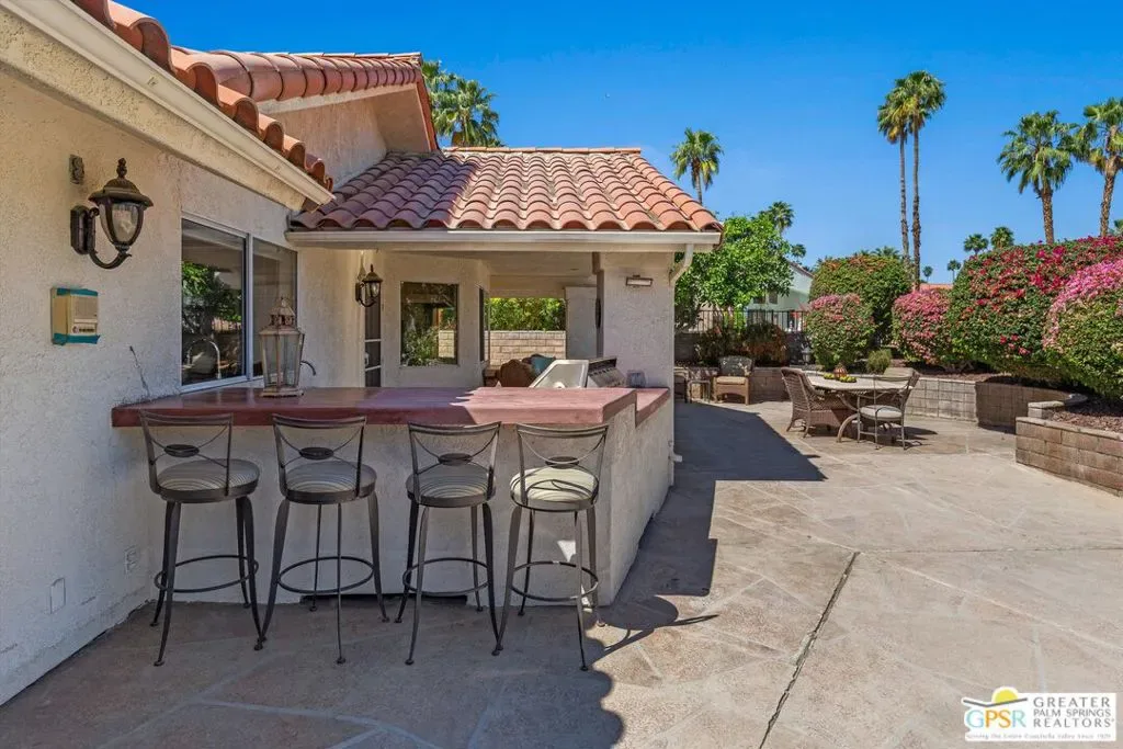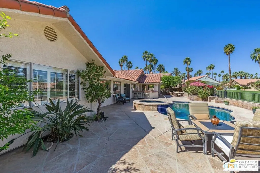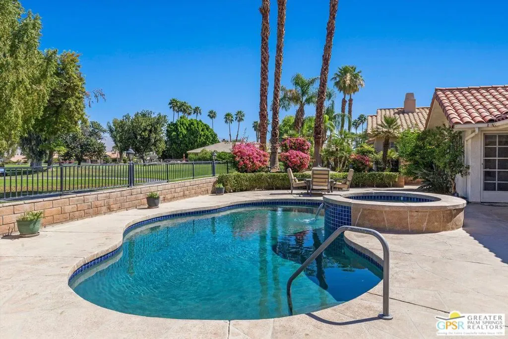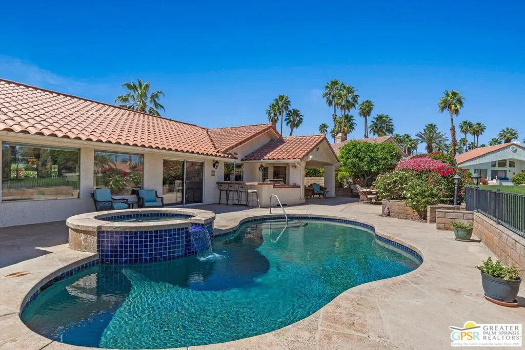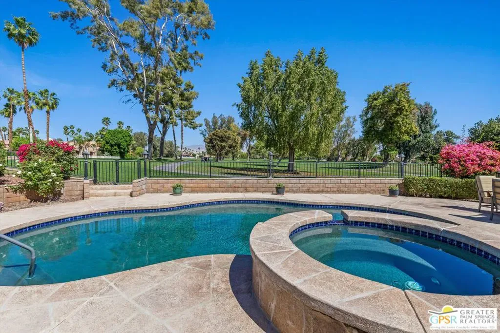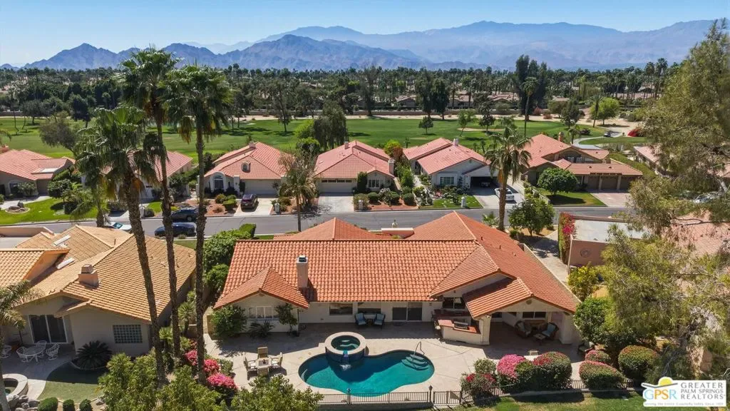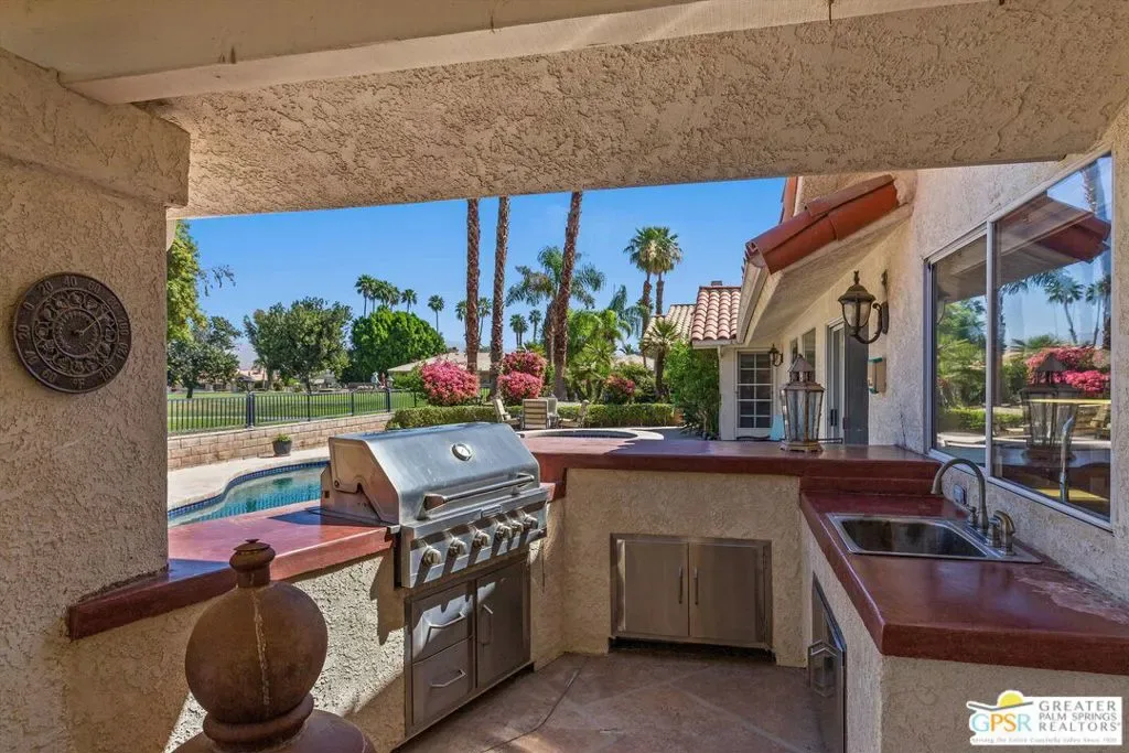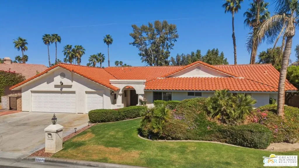 Discover the best of the best at Palm Desert’s guard-gated Avondale Golf Club, where this impressively upgraded home presents a premium setting on two fairways, panoramic golf course and mountain views, generous room inside and out, and an exceptional value that includes fine furnishings. Nearly 10,018 square feet, grounds are beautifully landscaped and maintained, proudly displaying a large front yard with colorful plantings, ample driveway parking, and a covered entry with two custom leaded-glass doors. Experience the ultimate Southern California lifestyle in a backyard complete with Pebble Tec-finished pool and spa, sun and shade patios, and a built-in outdoor kitchen with BBQ and sink. Interiors at the luxurious single-level residence are equally inviting. Measuring approximately 2,750 square feet, the open design hosts three ensuite bedrooms and four baths, with one bedroom featuring a built-in desk, shelving and cabinetry. Large windows welcome natural light and fairway views into the living and dining rooms, which embellish entertaining with a corner fireplace, backyard access, and a walk-in wet bar with under-counter beverage refrigerator. Easy meal prep and memorable gatherings are both at home in the extra-spacious kitchen, where mocha-finished wood cabinetry with glass uppers, expansive custom granite countertops with full backsplash, a large island and a French door opening to the backyard are featured. Cabinetry continues in a casual breakfast nook with bay window and built-in desk, and upgraded stainless steel appliances include a five-burner cooktop. In the private primary suite, homeowners are treated to a sitting area with French door to the backyard, a soaking tub, separate shower, picture-frame mirrors, dual sinks, custom granite surrounds and a walk-in closet. An attached two-car garage boasts a dedicated golf cart space, and the laundry room is enhanced with a sink, cabinetry and outdoor access. Large-format travertine tile shines throughout the home and is joined by custom paint, elegant lighting fixtures, mirrored wardrobe doors, ceiling fans, plantation shutters and in-ceiling speakers. Moments from shopping, fine dining, the Acrisure Arena and 5-star resorts, Avondale offers residents an exquisite lifestyle complete with a pristine golf course, scenic lakes, and a fabulous clubhouse with countless amenities.