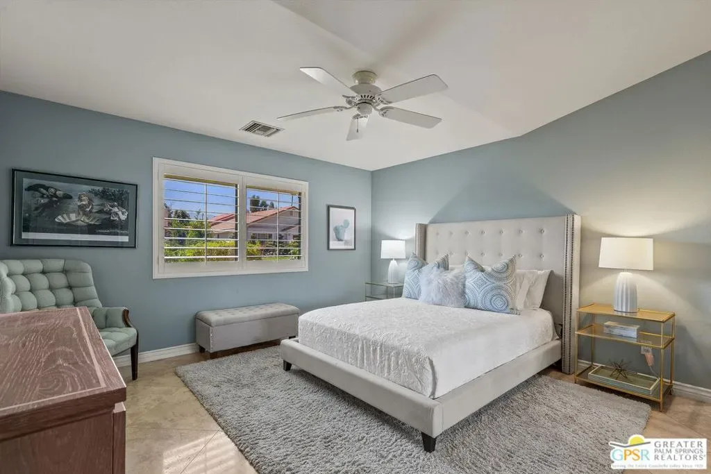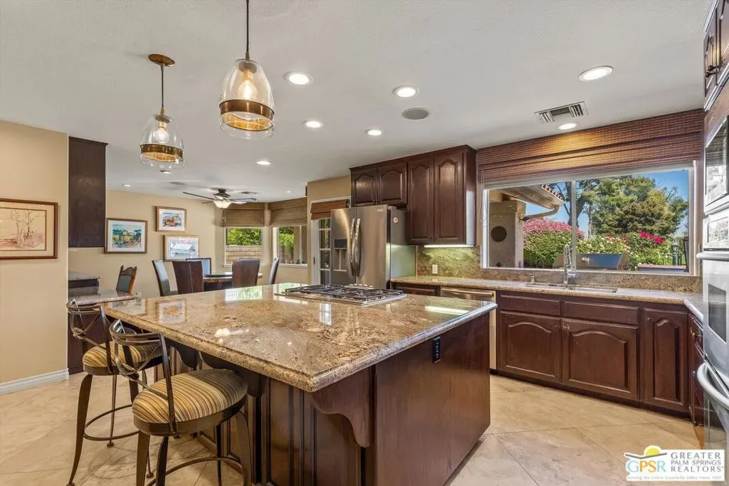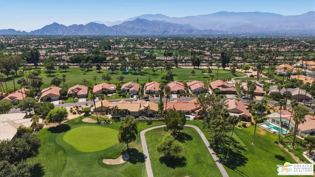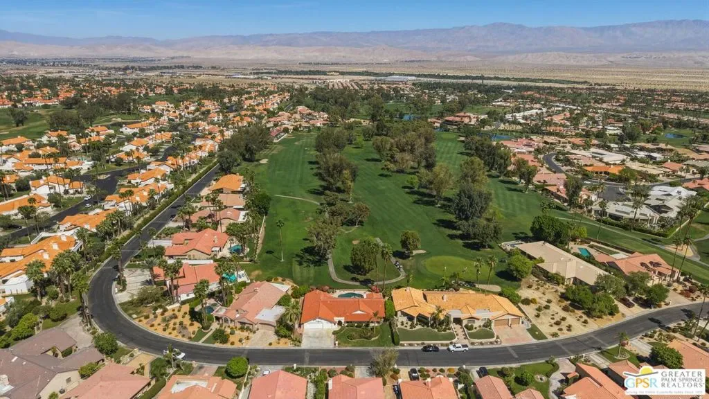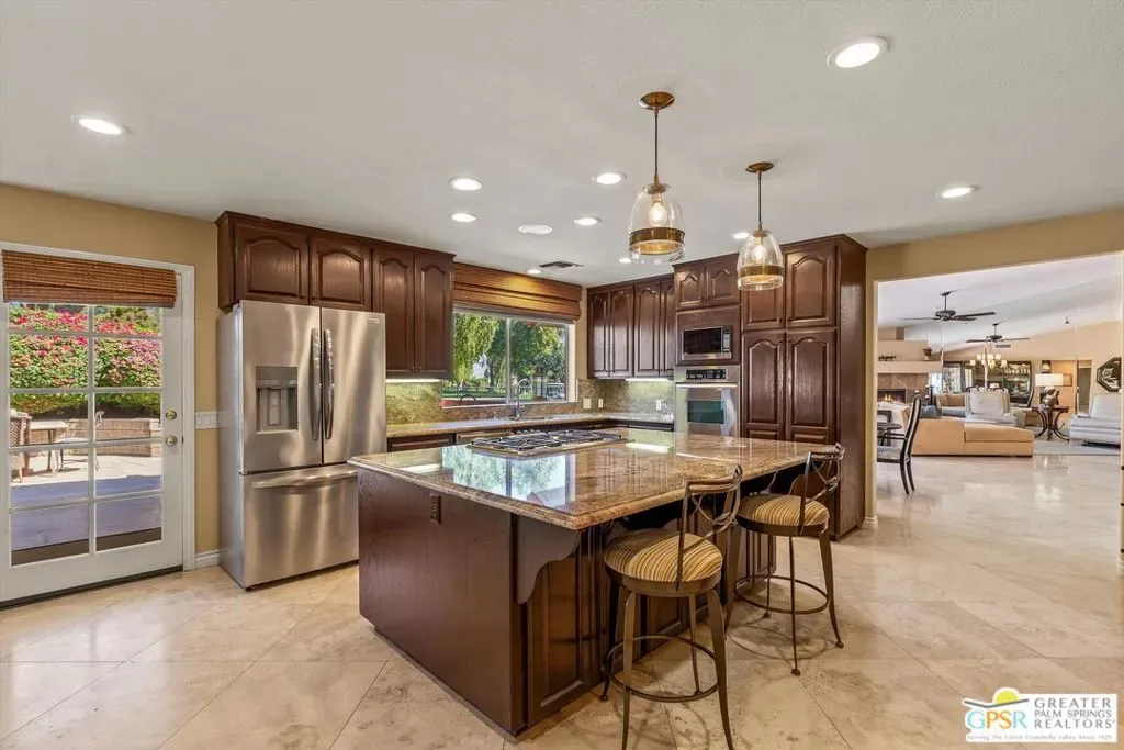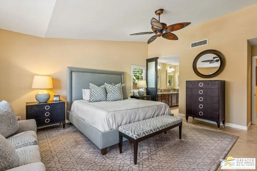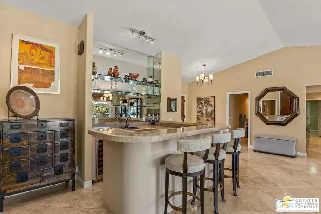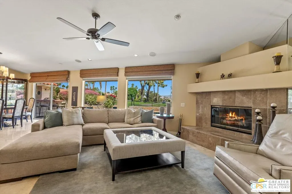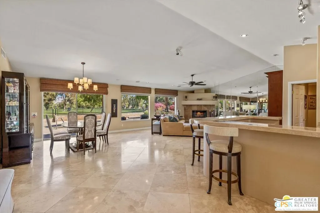 Discover the best of the best at Palm Desert’s guard-gated Avondale Golf Club, where this impressively upgraded home presents a premium setting on two fairways, panoramic golf course and mountain views, generous room inside and out, and an exceptional value that includes fine furnishings. Nearly 10,018 square feet, grounds are beautifully landscaped and maintained, proudly displaying a large front yard with colorful plantings, ample driveway parking, and a covered entry with two custom leaded-glass doors. Experience the ultimate Southern California lifestyle in a backyard complete with Pebble Tec-finished pool and spa, sun and shade patios, and a built-in outdoor kitchen with BBQ and sink. Interiors at the luxurious single-level residence are equally inviting. Measuring approximately 2,750 square feet, the open design hosts three ensuite bedrooms and four baths, with one bedroom featuring a built-in desk, shelving and cabinetry. Large windows welcome natural light and fairway views into the living and dining rooms, which embellish entertaining with a corner fireplace, backyard access, and a walk-in wet bar with under-counter beverage refrigerator. Easy meal prep and memorable gatherings are both at home in the extra-spacious kitchen, where mocha-finished wood cabinetry with glass uppers, expansive custom granite countertops with full backsplash, a large island and a French door opening to the backyard are featured. Cabinetry continues in a casual breakfast nook with bay window and built-in desk, and upgraded stainless steel appliances include a five-burner cooktop. In the private primary suite, homeowners are treated to a sitting area with French door to the backyard, a soaking tub, separate shower, picture-frame mirrors, dual sinks, custom granite surrounds and a walk-in closet. An attached two-car garage boasts a dedicated golf cart space, and the laundry room is enhanced with a sink, cabinetry and outdoor access. Large-format travertine tile shines throughout the home and is joined by custom paint, elegant lighting fixtures, mirrored wardrobe doors, ceiling fans, plantation shutters and in-ceiling speakers. Moments from shopping, fine dining, the Acrisure Arena and 5-star resorts, Avondale offers residents an exquisite lifestyle complete with a pristine golf course, scenic lakes, and a fabulous clubhouse with countless amenities.