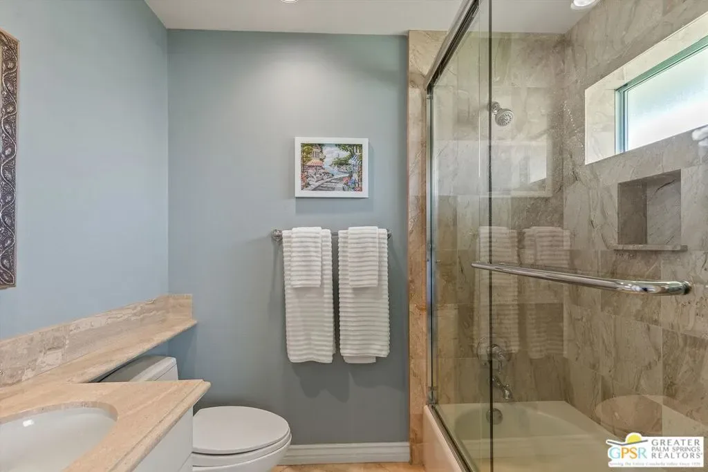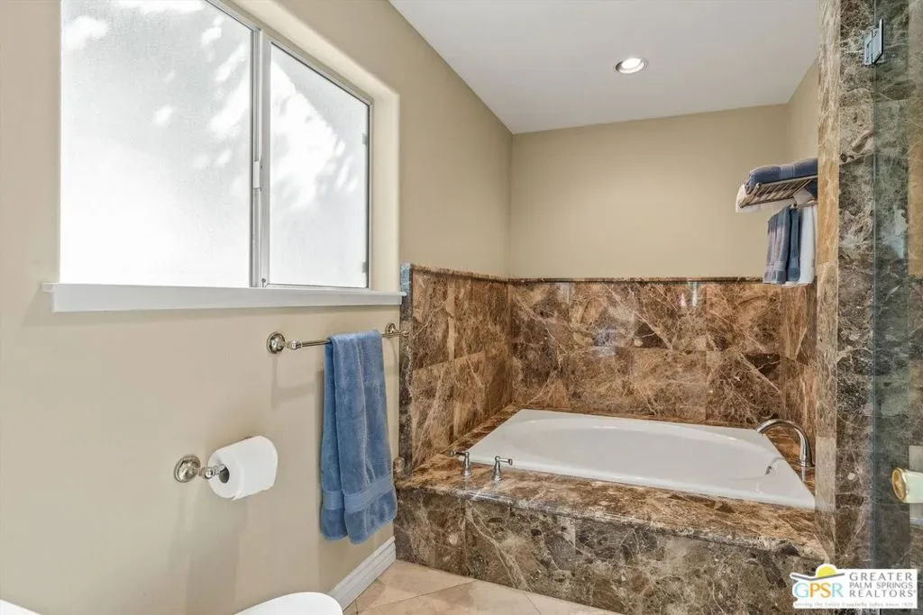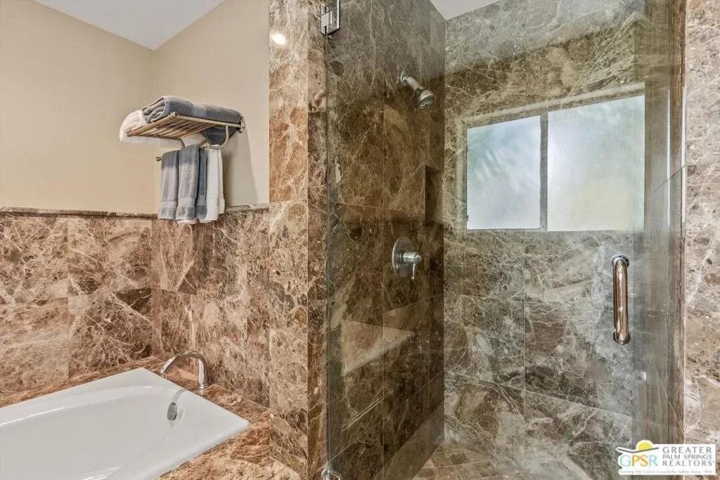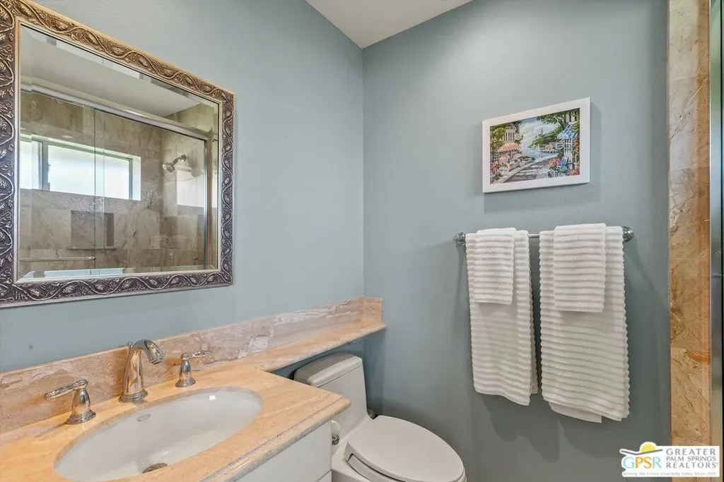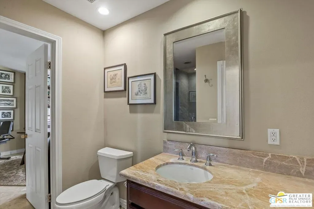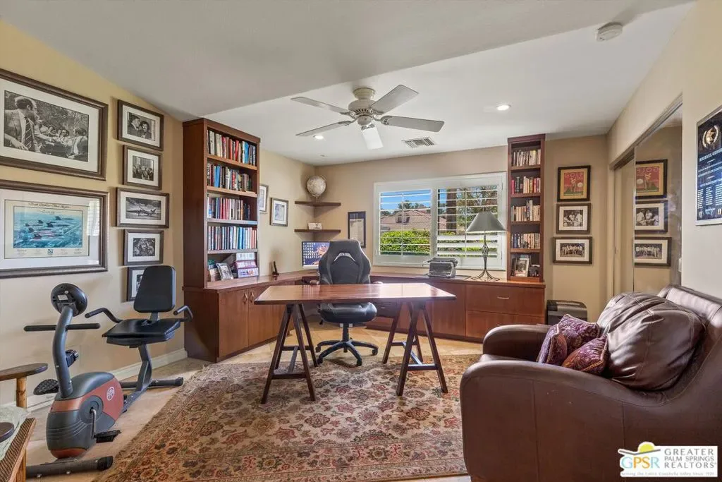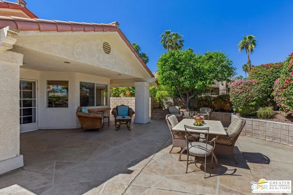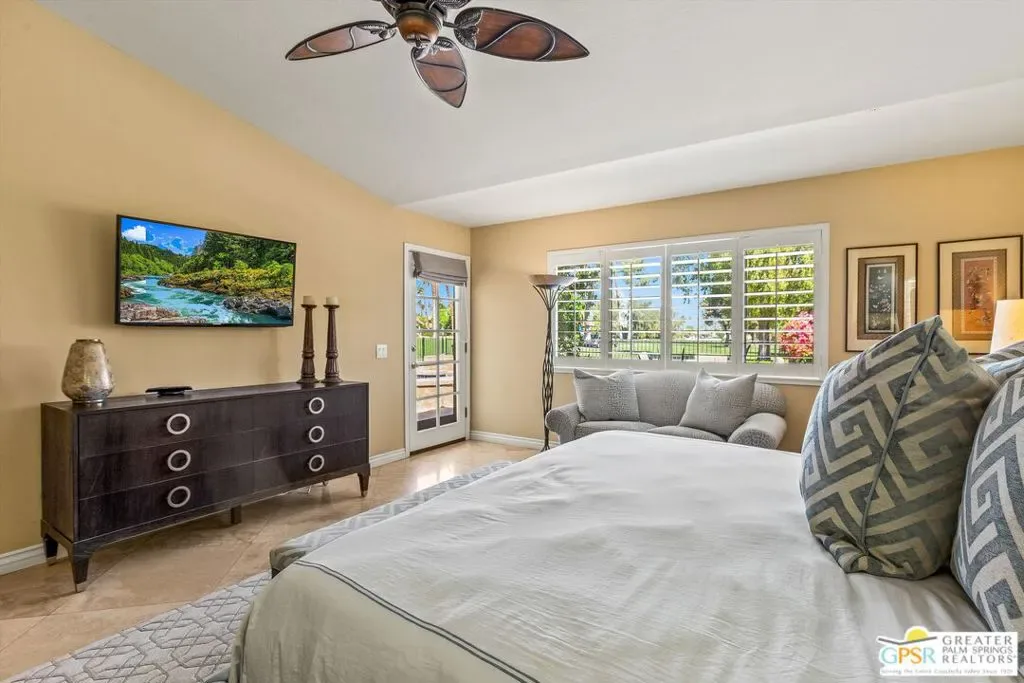 Discover the best of the best at Palm Desert’s guard-gated Avondale Golf Club, where this impressively upgraded home presents a premium setting on two fairways, panoramic golf course and mountain views, generous room inside and out, and an exceptional value that includes fine furnishings. Nearly 10,018 square feet, grounds are beautifully landscaped and maintained, proudly displaying a large front yard with colorful plantings, ample driveway parking, and a covered entry with two custom leaded-glass doors. Experience the ultimate Southern California lifestyle in a backyard complete with Pebble Tec-finished pool and spa, sun and shade patios, and a built-in outdoor kitchen with BBQ and sink. Interiors at the luxurious single-level residence are equally inviting. Measuring approximately 2,750 square feet, the open design hosts three ensuite bedrooms and four baths, with one bedroom featuring a built-in desk, shelving and cabinetry. Large windows welcome natural light and fairway views into the living and dining rooms, which embellish entertaining with a corner fireplace, backyard access, and a walk-in wet bar with under-counter beverage refrigerator. Easy meal prep and memorable gatherings are both at home in the extra-spacious kitchen, where mocha-finished wood cabinetry with glass uppers, expansive custom granite countertops with full backsplash, a large island and a French door opening to the backyard are featured. Cabinetry continues in a casual breakfast nook with bay window and built-in desk, and upgraded stainless steel appliances include a five-burner cooktop. In the private primary suite, homeowners are treated to a sitting area with French door to the backyard, a soaking tub, separate shower, picture-frame mirrors, dual sinks, custom granite surrounds and a walk-in closet. An attached two-car garage boasts a dedicated golf cart space, and the laundry room is enhanced with a sink, cabinetry and outdoor access. Large-format travertine tile shines throughout the home and is joined by custom paint, elegant lighting fixtures, mirrored wardrobe doors, ceiling fans, plantation shutters and in-ceiling speakers. Moments from shopping, fine dining, the Acrisure Arena and 5-star resorts, Avondale offers residents an exquisite lifestyle complete with a pristine golf course, scenic lakes, and a fabulous clubhouse with countless amenities.