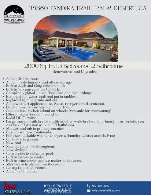 Courtesy of KELLER WILLIAMS-LA QUINTA. Disclaimer: All data relating to real estate for sale on this page comes from the Broker Reciprocity (BR) of the California Regional Multiple Listing Service. Detailed information about real estate listings held by brokerage firms other than James Outland include the name of the listing broker. Neither the listing company nor James Outland shall be responsible for any typographical errors, misinformation, misprints and shall be held totally harmless. The Broker providing this data believes it to be correct, but advises interested parties to confirm any item before relying on it in a purchase decision. Copyright 2026. California Regional Multiple Listing Service. All rights reserved. 38560 Tandika N TR