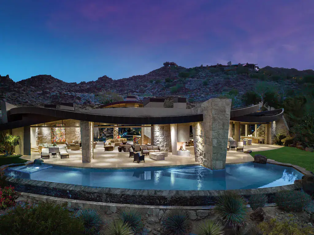 A sculptural work of architecture set into a private hillside, this extraordinary residence is the result of the visionary imagination of renowned designer Guy Dreier. Thoughtfully integrated into its natural surroundings, the home embraces the terrain and uses the landscape itself as living art. Private gated courtyard with desert landscape sets the stage as you approach an oversized glass pivot door that opens to a world of exquisite detail–floor-to-ceiling curved glass walls, pocketing sliders, and expansive windows that frame breathtaking views and define the home’s unparalleled lifestyle. Sophisticated yet serene, the residence offers quiet luxury at its finest, balancing open spaces with intimate seating areas anchored by a custom-designed fireplace and a discreetly concealed pop-up television. A sleek, understated sit-up wet bar flows effortlessly to the outdoors, where, at the touch of a button, indoor living extends seamlessly into an exceptional outdoor environment. Waterfalls, an additional fireplace, and multiple entertaining areas create an inviting setting for both grand gatherings and relaxed evenings. The primary suite is a private sanctuary, featuring its own lounging area, a dramatic wall of glass that brings nature indoors, and a beautiful fireplace that enhances the sense of calm and also includes separate his and her bathrooms. A private study with a view that is only experienced at this elevation looking over multiple fairways and the mountain range beyond. Three generously sized and impeccably appointed guest suites with full bathrooms and walk–in closets complete the home, including a detached hillside casita with spectacular views, a seating area, and dual bathrooms–so comfortable, guests may never want to leave. An entertainer’s pool and spa further elevate the outdoor experience, completing a residence that is as livable as it is visually stunning. A new roof and solar were installed this year.